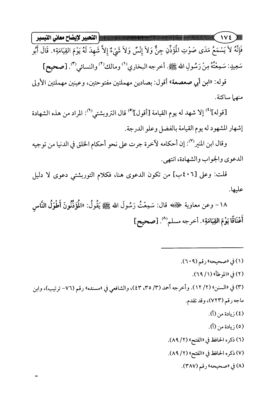 18 - وعن معاوية - رضي الله عنه - قال: سَمِعْتُ رَسُولَ الله - صلى الله عليه وسلم - يَقُولُ: "المُؤَذِّنُونَ أَطْوَلُ النَّاسِ أَعْنَاقًا يَوْمَ القِيَامَةِ". أخرجه مسلم (¬8). [صحيح]