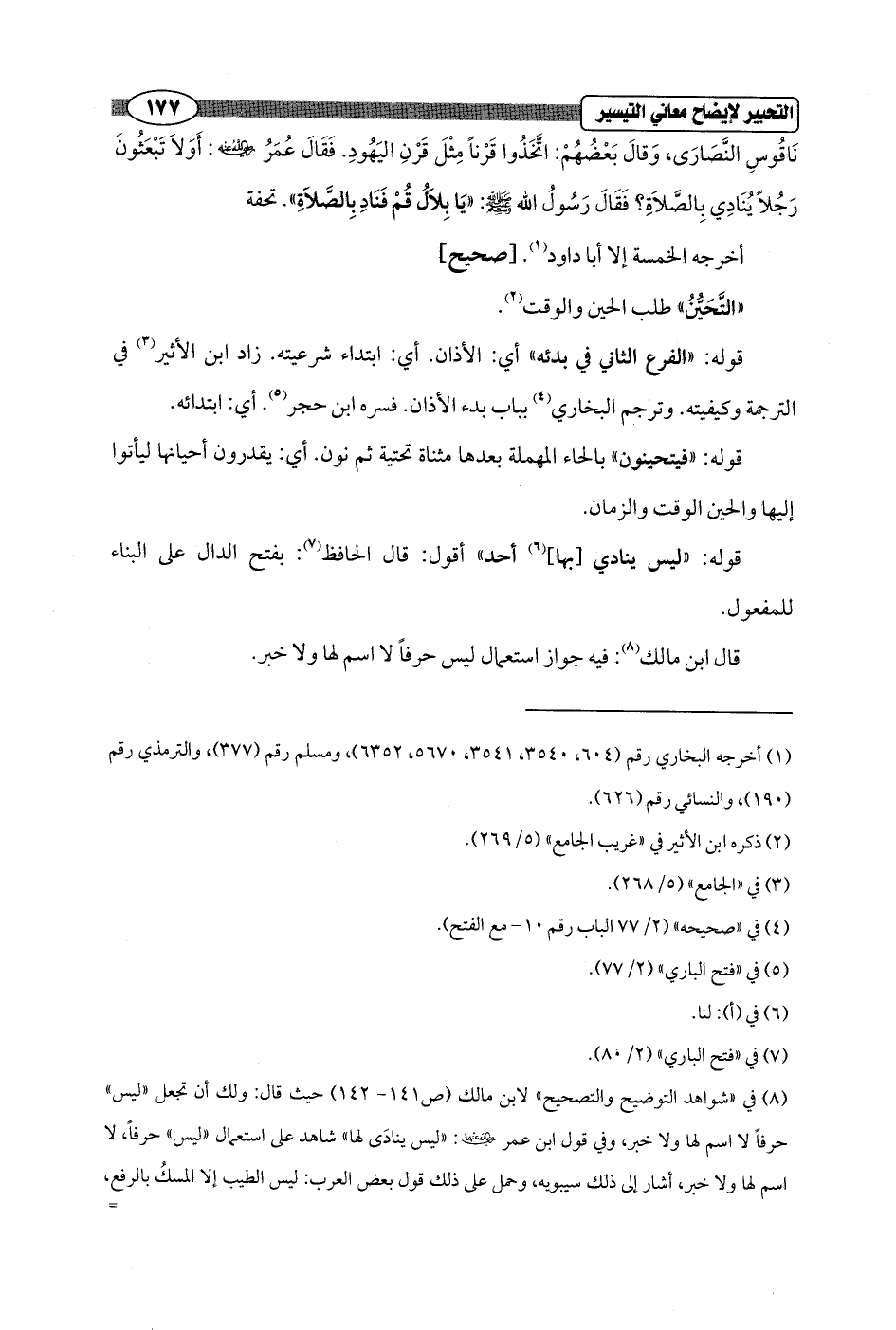 (¬8) في "شواهد التوضيح والتصحيح" لابن مالك (ص 141 - 142) حيث قال: ولك أن تجعل "ليس" حرفاً لا اسم لها ولا خبر، وفي قول ابن عمر - رضي الله عنهما -: "ليس ينادَى لها" شاهد على استعمال "ليس" حرفاً، لا اسم لها ولا خبر، أشار إلى ذلك سيبويه، وحمل على ذلك قول بعض العرب: ليس الطيب إلا المسكُ بالرفع، =