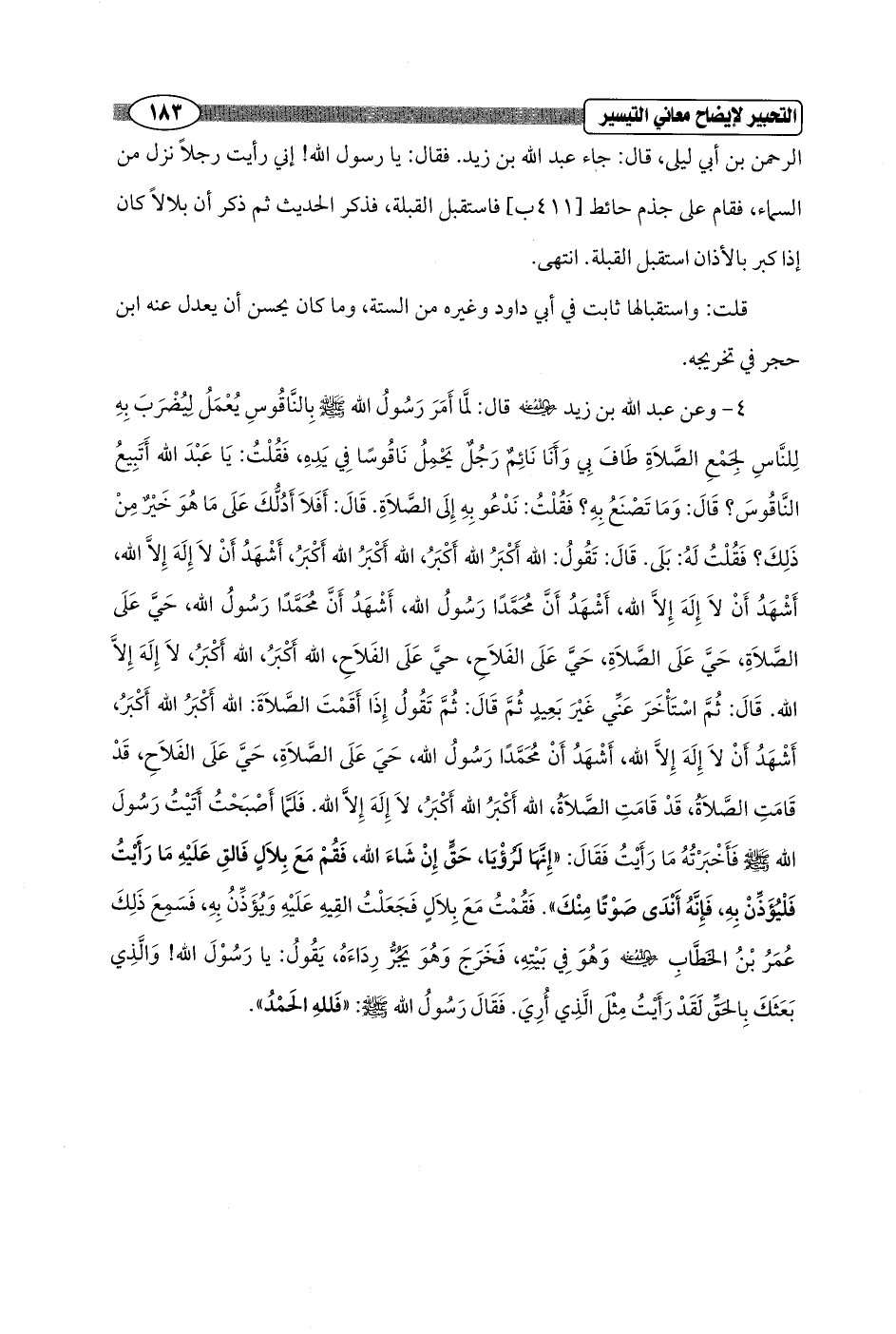4 - وعن عبد الله بن زيد - رضي الله عنه - قال: لمَّا أَمَرَ رَسُولُ الله - صلى الله عليه وسلم - بالنَّاقُوسِ يُعْمَلُ لِيُضْرَبَ بِهِ لِلنَّاسِ لِجَمْعِ الصَّلاَةِ طَافَ بِي وَأَنَا نَائِمٌ رَجُلٌ يَحمِلُ نَاقُوسًا فِي يَدِهِ, فَقُلْتُ: يَا عَبْدَ الله أَتَبِيعُ النَّاقُوسَ؟ قَالَ: وَمَا تَصْنَعُ بِهِ؟ فَقُلْتُ: نَدْعُو بِهِ إِلَى الصَّلاَةِ. قَالَ: أَفَلاَ أَدُلُّكَ عَلَى مَا هُوَ خَيْرٌ مِنْ ذَلِكَ؟ فَقُلْتُ لَهُ: بَلَى. قَالَ: تَقُولُ: الله أَكْبَرُ الله أَكْبَرُ, الله أَكْبَرُ الله أَكْبَرُ، أَشْهَدُ أَنْ لاَ إِلَهَ إِلاَّ الله، أَشْهَدُ أَنْ لاَ إِلَهَ إِلاَّ الله، أَشْهَدُ أَنَّ مُحَمَّدًا رَسُولُ الله، أَشْهَدُ أَنَّ مُحَمَّدًا رَسُولُ الله، حَيَّ عَلَى الصَّلاَةِ، حَيَّ عَلَى الصَّلاَةِ, حَيَّ عَلَى الفَلاَحِ، حيَّ عَلَى الفَلاَحِ، الله أَكْبَرُ، الله أَكْبَرُ، لاَ إِلَهَ إِلاَّ الله. قَالَ: ثُمَّ اسْتَأْخَرَ عَنِّي غَيْرَ بَعِيدٍ ثُمَّ قَالَ: ثُمَّ تَقُولُ إِذَا أَقَمْتَ الصَّلاَةَ: الله أَكْبَرُ الله أَكْبَرُ، أَشْهَدُ أَنْ لاَ إِلَهَ إِلاَّ الله، أَشْهَدُ أَنْ مُحَمَّدًا رَسُولُ الله، حَيَ عَلَى الصَّلاَةِ، حَيَّ عَلَى الفَلاَحِ، قَدْ قَامَتِ الصَّلاَةِ، قَدْ قَامَتِ الصَّلاَةُ، الله أَكْبَرُ الله أَكْبَرُ، لاَ إِلَهَ إِلاَّ الله. فَلَمَّا أَصْبَحْتُ أَتَيْتُ رَسُولَ الله - صلى الله عليه وسلم - فَأَخْبَرْتُهُ مَا رَأَيْتُ فَقَالَ: "إِنَّهَا على لَرُؤْيَا، حَقٍّ إِنْ شَاءَ الله، فَقُمْ مَعَ بِلاَلٍ فَالقِ عَلَيْهِ مَا رَأَيْتُ فَلْيُؤَذِّنْ بِهِ, فَإِنَّهُ أَنْدَى صَوْتًا مِنْكَ". فَقُمْتُ مَعَ بِلاَلٍ فَجَعَلْتُ القِيهِ عَلَيْهِ وَيُؤَذِّنُ بِهِ، فَسَمِعَ ذَلِكَ عُمَرُ بْنُ الخَطَّابِ - رضي الله عنه - وَهُوَ فِي بَيْتِهِ, فَخَرَجَ وَهُوَ يَجُرُّ رِدَاءَهُ, يَقُولُ: يا رَسُوْلَ الله! وَالَّذِي بَعَثَكَ بِالحَقِّ لَقَدْ رَأَيْتُ مِثْلَ الَّذِي أُرِيَ. فَقَالَ رَسُولُ الله - صلى الله عليه وسلم -: "فَللهِ الحَمْدُ".