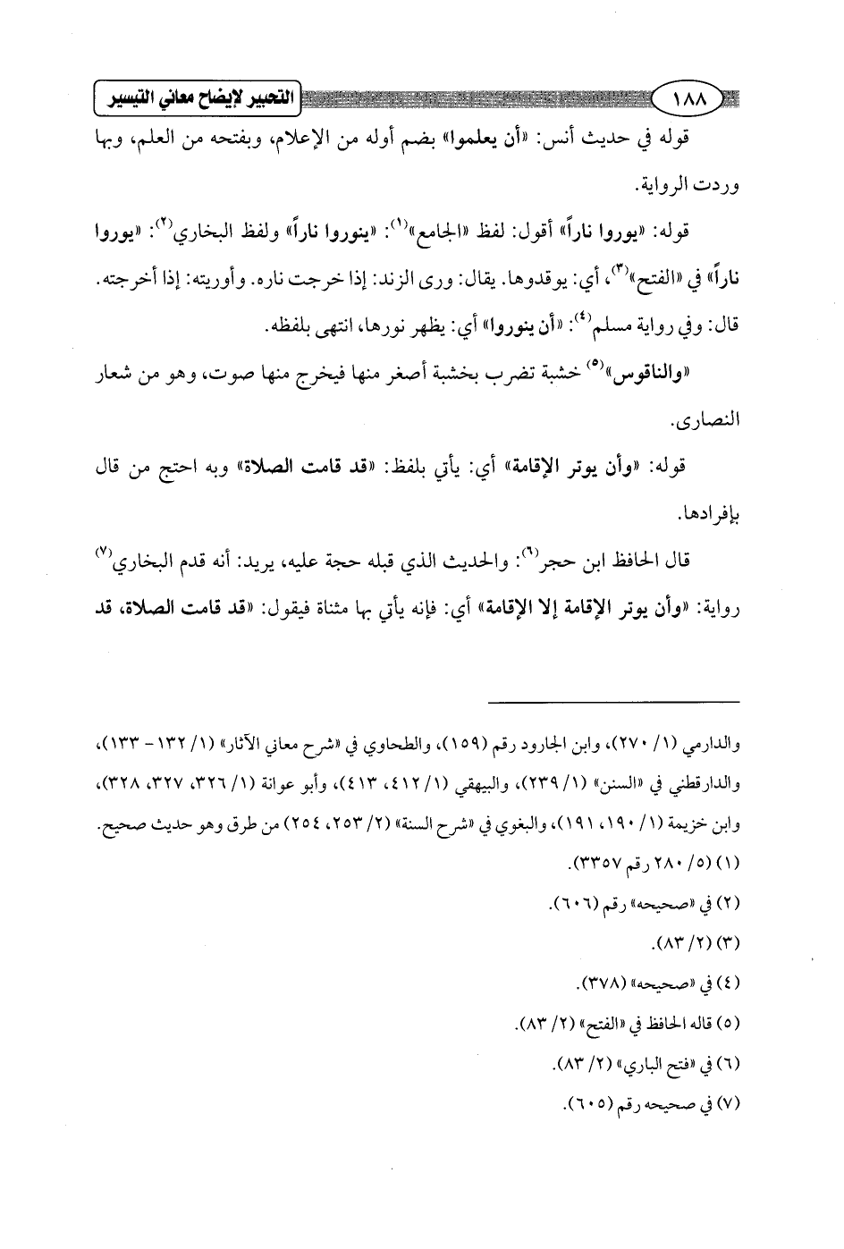 قوله: "يوروا ناراً" أقول: لفظ "الجامع" (¬1): "ينوروا ناراً" ولفظ البخاري (¬2): "يوروا ناراً" في "الفتح" (¬3)، أي: يوقدوها. يقال: ورى الزند: إذا خرجت ناره. وأوريته: إذا أخرجته. قال: وفي رواية مسلم (¬4): "أن ينوروا" أي: يظهر نورها، انتهى بلفظه.
