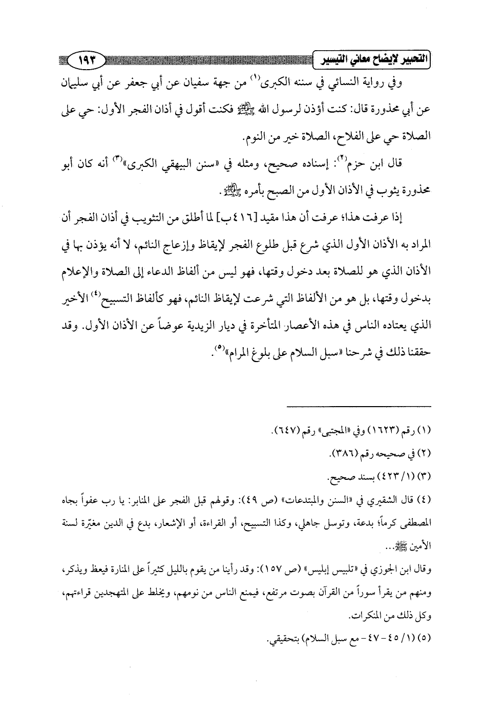 إذا عرفت هذا؛ عرفت أن هذا مقيد [416 ب] لما أطلق من التثويب في أذان الفجر أن المراد به الأذان الأول الذي شرع قبل طلوع الفجر لإيقاظ وإزعاج النائم، لا أنه يؤذن بها في الأذان الذي هو للصلاة بعد دخول وقتها، فهو ليس من ألفاظ الدعاء إلى الصلاة والإعلام بدخول وقتها، بل هو من الألفاظ التي شرعت لإيقاظ النائم، فهو كألفاظ التسبيح (¬4) الأخير الذي يعتاده الناس في هذه الأعصار المتأخرة في ديار الزيدية عوضاً عن الأذان الأول. وقد حققنا ذلك في شرحنا "سبل السلام على بلوغ المرام" (¬5).