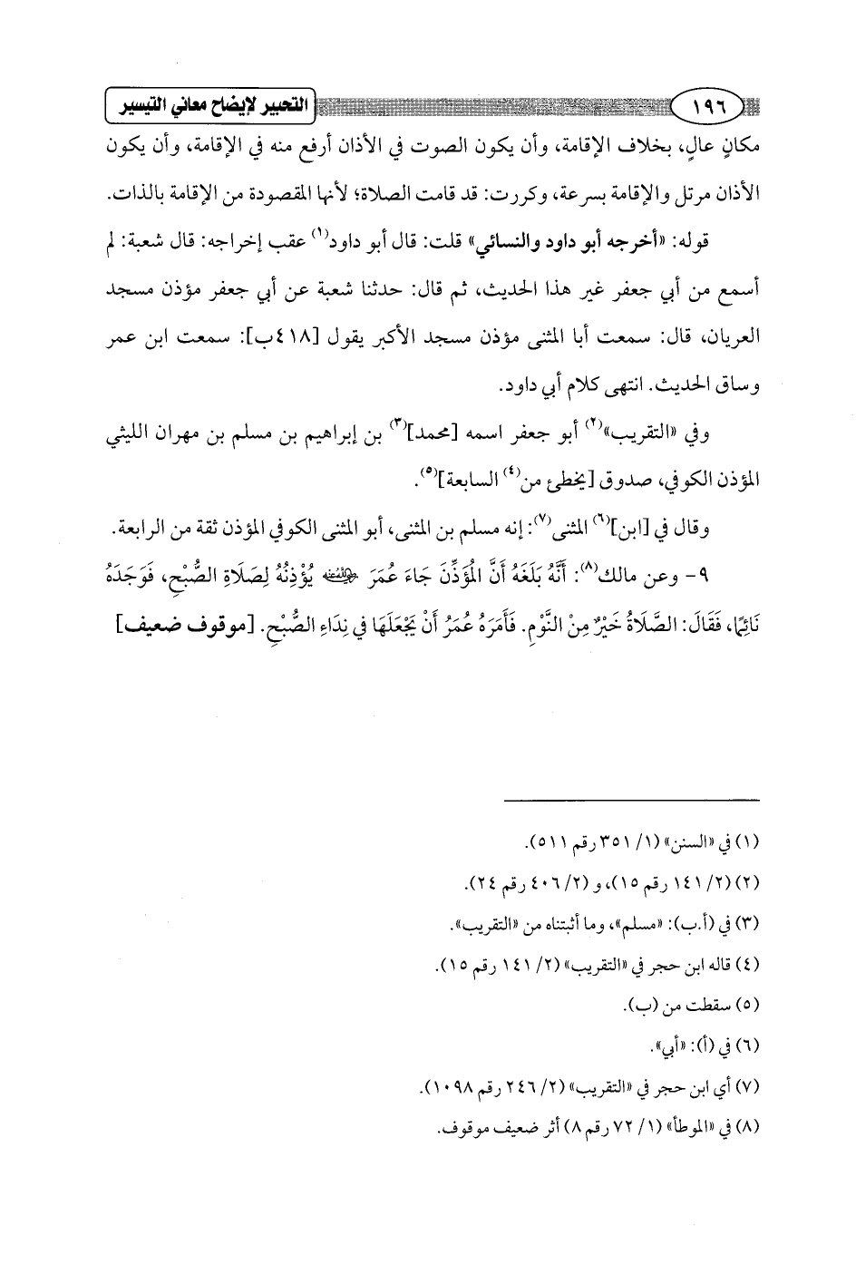 قوله: "أخرجه أبو داود والنسائي" قلت: قال أبو داود (¬1) عقب إخراجه: قال شعبة: لم أسمع من أبي جعفر غير هذا الحديث، ثم قال: حدثنا شعبة عن أبي جعفر مؤذن مسجد العريان، قال: سمعت أبا المثنى مؤذن مسجد الأكبر يقول [418 ب]: سمعت ابن عمر وساق الحديث. انتهى كلام أبي داود.