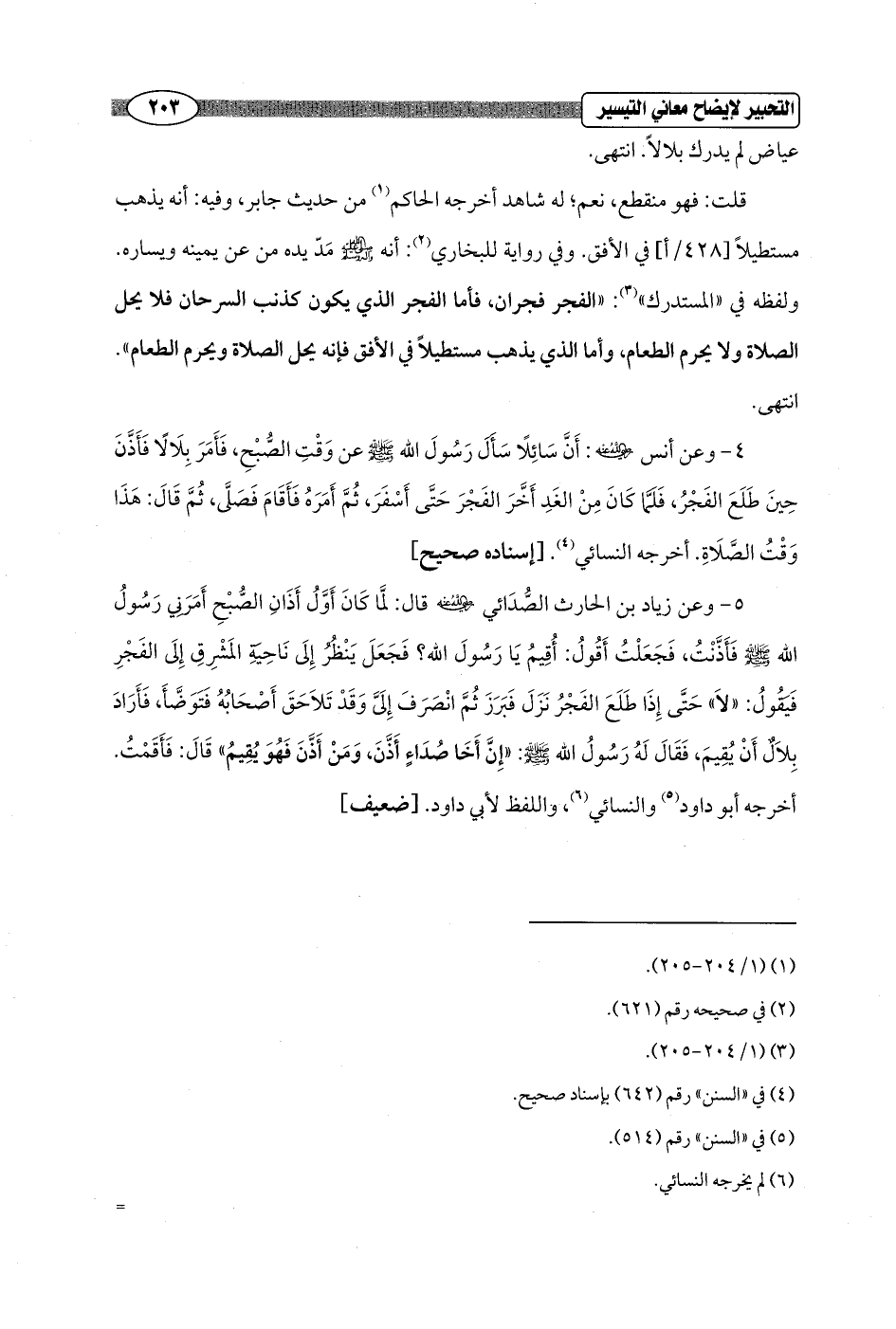 4 - وعن أنس - رضي الله عنه -: أَنَّ سَائِلًا سَأَلَ رَسُولَ الله - صلى الله عليه وسلم - عن وَقْتِ الصُّبْحِ، فَأَمَرَ بِلَالًا فَأَذَّنَ حِينَ طَلَعَ الفَجْرُ، فَلَمَّا كَانَ مِنْ الغَدِ أَخَّرَ الفَجْرَ حَتَّى أَسْفَرَ، ثُمَّ أَمَرَهُ فَأَقَامَ فَصَلَّى، ثُمَّ قَالَ: هَذَا وَقْتُ الصَّلَاةِ. أخرجه النسائي (¬4). [إسناده صحيح]