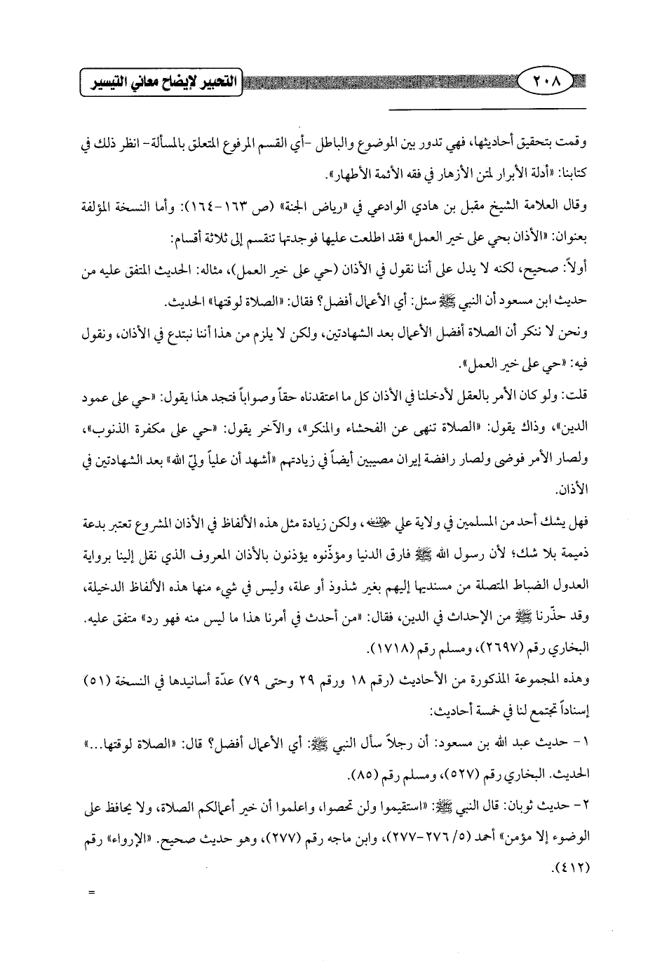 وقال العلامة الشيخ مقبل بن هادي الوادعي في "رياض الجنة" (ص 163 - 164): وأما النسخة المؤلفة بعنوان: "الأذان بحي على خير العمل" فقد اطلعت عليها فوجدتها تنقسم إلى ثلاثة أقسام: