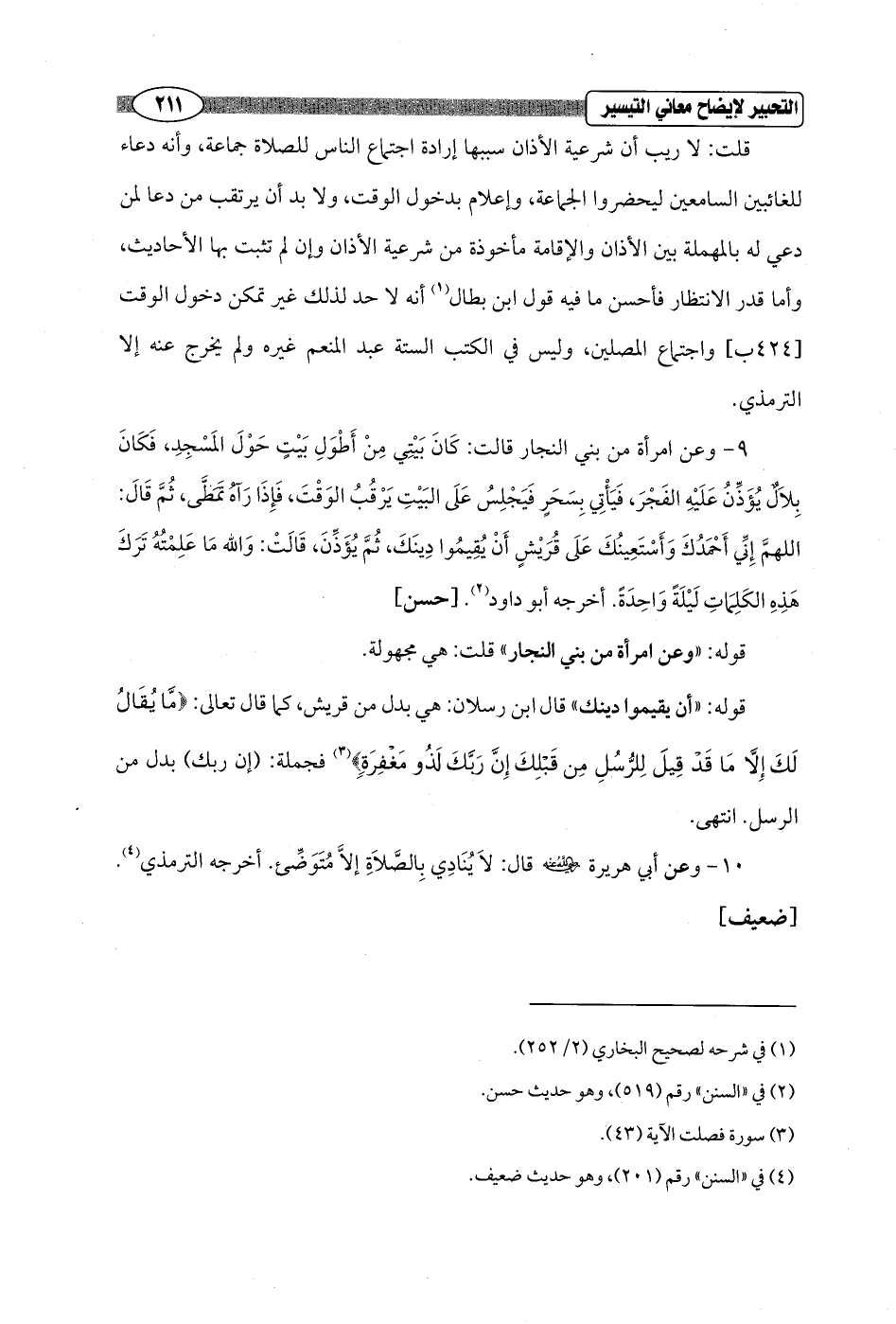 9 - وعن امرأة من بني النجار قالت: كَانَ بَيْتِي مِنْ أَطْوَلِ بَيْتٍ حَوْلَ المَسْجِدِ، فَكَانَ بِلاَلٌ يُؤَذِّنُ عَلَيْهِ الفَجْرَ، فَيَأْتِي بِسَحَرٍ فَيَجْلِسُ عَلَى البَيْتِ يَرْقُبُ الوَقْتَ، فَإِذَا رَآهُ تَمَطَّى، ثُمَّ قَالَ: اللهمَّ إِنِّي أَحْمَدُكَ وَأَسْتَعِينُكَ عَلَى قُرَيْشٍ أَنْ يُقِيمُوا دِينَكَ, ثُمَّ يُؤَذِّنَ، قَالَتْ: وَالله مَا عَلِمْتُهُ تَرَكَ هَذِهِ الكَلِمَاتِ لَيْلَةً وَاحِدَةً. أخرجه أبو داود (¬2). [حسن]