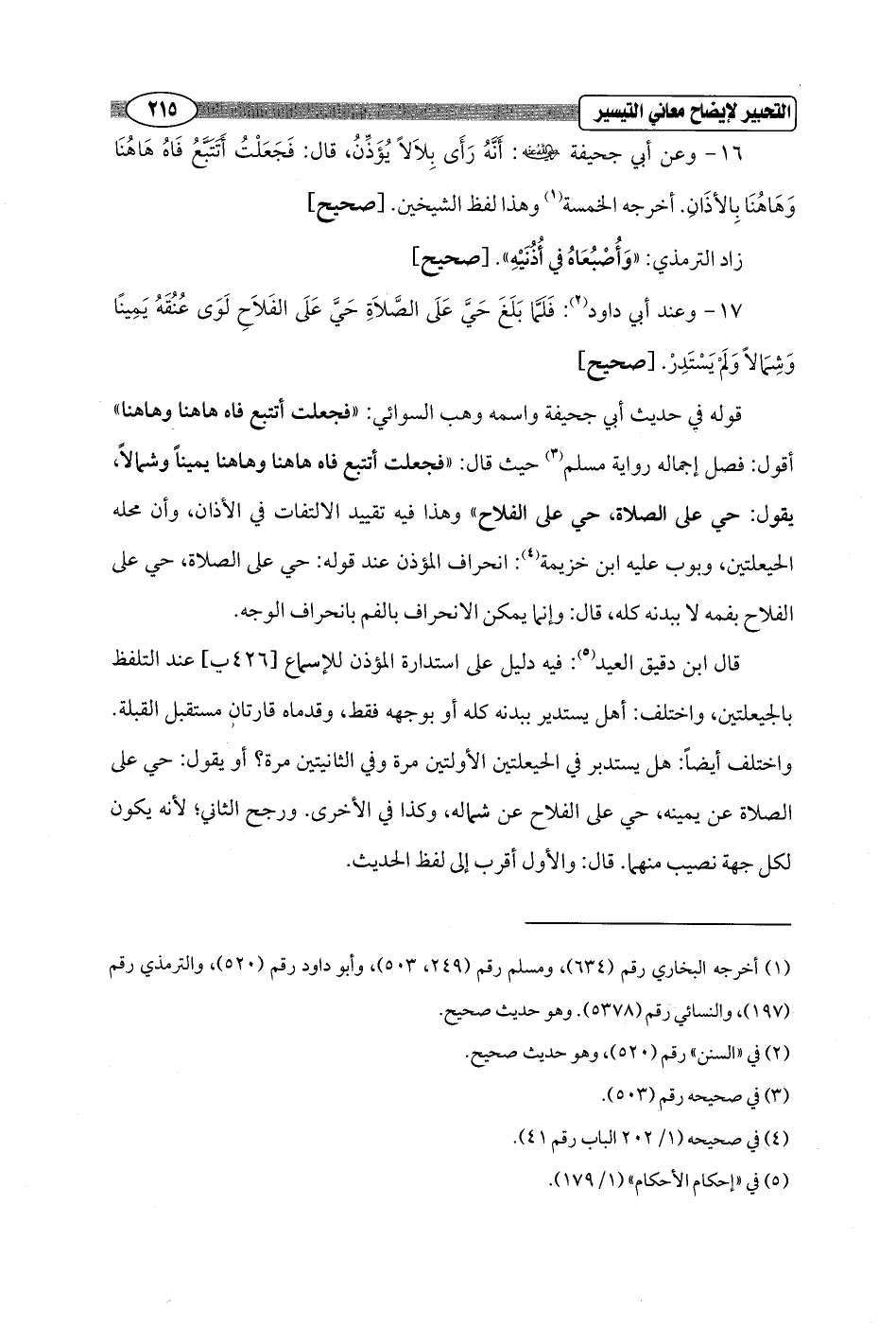 16 - وعن أبي جحيفة - رضي الله عنه -: أَنَّهُ رَأَى بِلاَلاً يُؤَذِّنُ، قال: فَجَعَلْتُ أَتَبَّعُ فَاهُ هَا هُنَا وَهَا هُنَا بِالأذَان. أخرجه الخمسة (¬1) وهذا لفظ الشيخين. [صحيح]