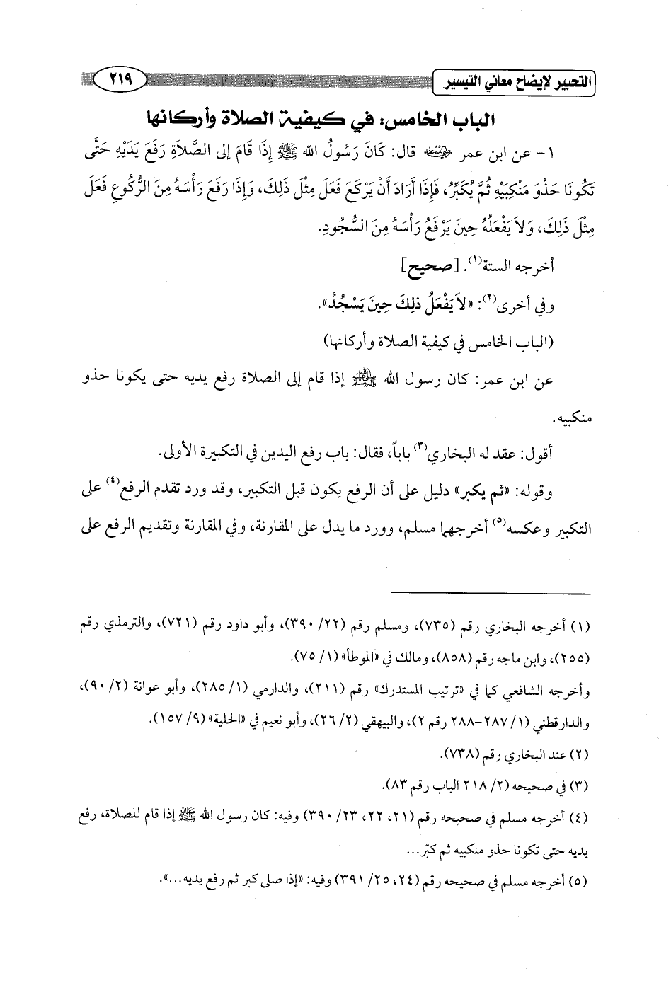 1 - عن ابن عمر - رضي الله عنه - قال: كَانَ رَسُولُ الله - صلى الله عليه وسلم - إِذَا قَامَ إلى الصَّلاَةِ رَفَعَ يَدَيْهِ حَتَّى تَكُونَا حَذْوَ مَنْكِبَيْهِ ثُمَّ يُكَبَّرُ، فَإِذَا أَرَادَ أَنْ يَرْكَعَ فَعَلَ مِثْلَ ذَلِكَ، وَإِذَا رَفَعَ رَأْسَهُ مِنَ الرُّكُوعِ فَعَلَ مِثْلَ ذَلِكَ، وَلاَ يَفْعَلُهُ حِينَ يَرْفَعُ رَأْسَهُ مِنَ السُّجُودِ.