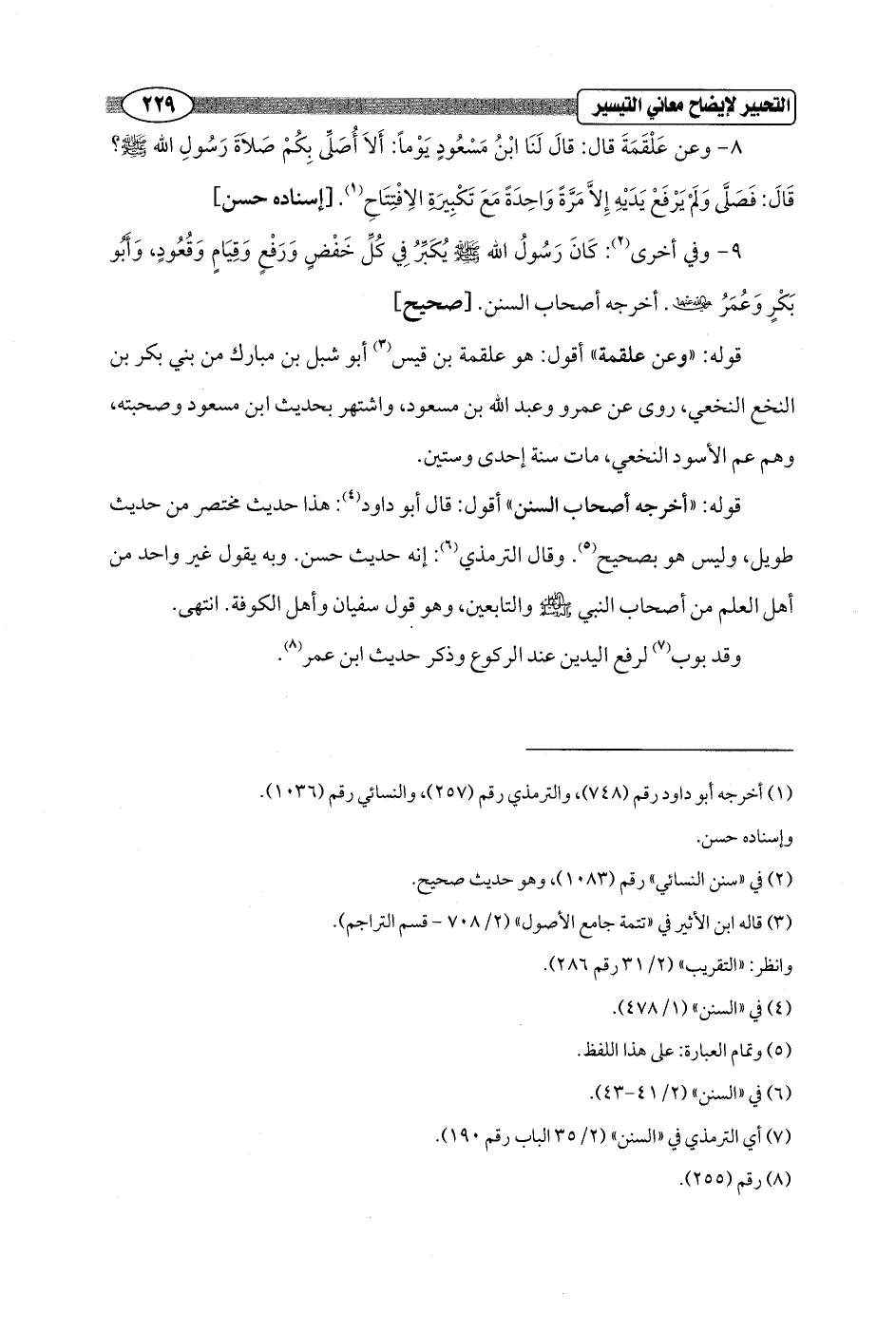 8 - وعن عَلْقَمَةَ قال: قَالَ لَنَا ابْنُ مَسْعُودٍ يَوْماً: أَلاَ أُصَلِّى بِكُمْ صَلاَةَ رَسُولِ الله - صلى الله عليه وسلم -؟ قَالَ: فَصَلَّى وَلَمْ يَرْفَعْ يَدَيْهِ إِلاَّ مَرَّةً وَاحِدَةً مَعَ تَكْبِيرَةِ الِافْتِتَاحِ (¬1). [إسناده حسن]
