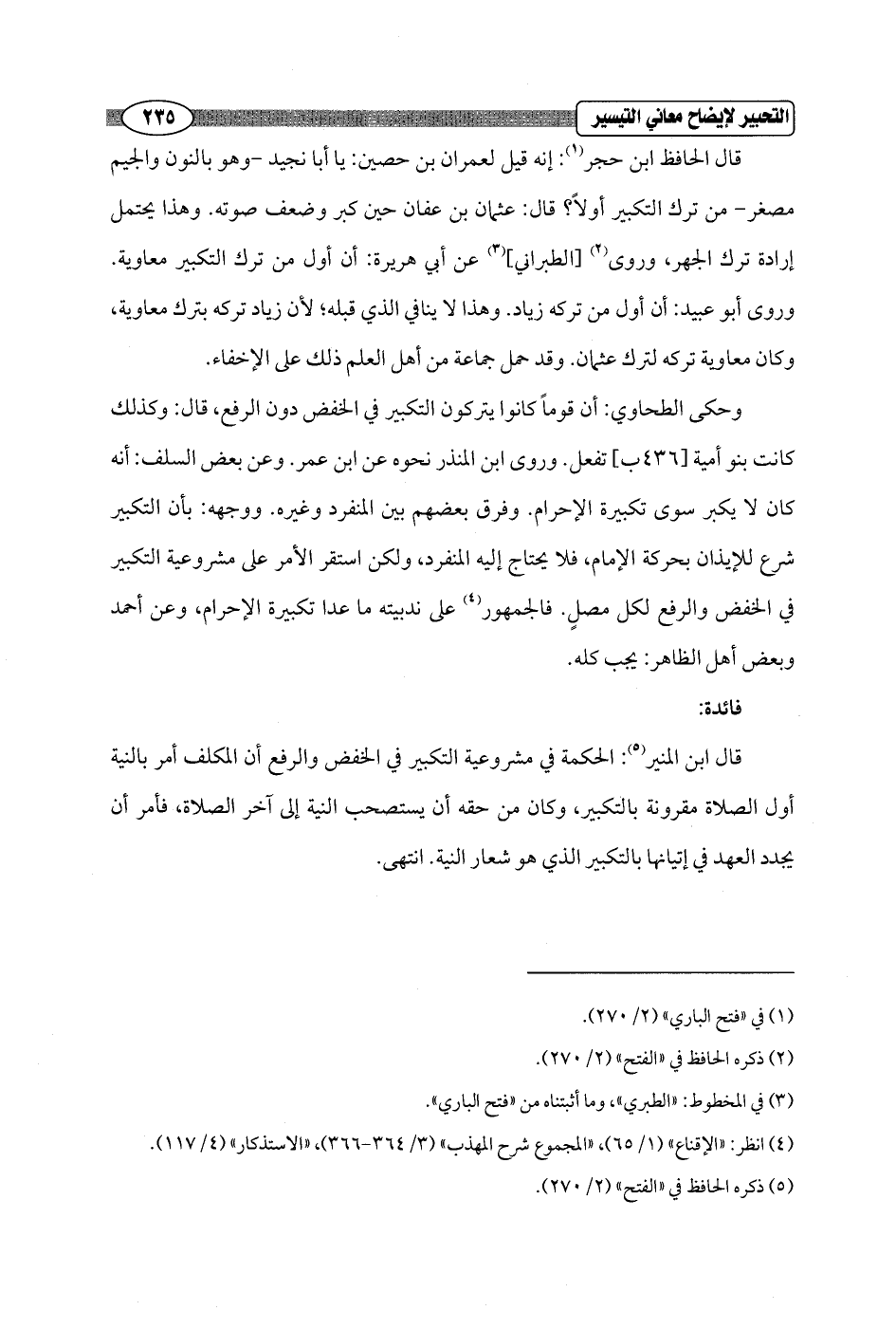 قال الحافظ ابن حجر (¬1): إنه قيل لعمران بن حصين: يا أبا نجيد - وهو بالنون والجيم مصغر - من ترك التكبير أولاً؟ قال: عثمان بن عفان حين كبر وضعف صوته. وهذا يحتمل إرادة ترك الجهر، وروى (¬2) [الطبراني] (¬3) عن أبي هريرة: أن أول من ترك التكبير معاوية. وروى أبو عبيد: أن أول من تركه زياد. وهذا لا ينافي الذي قبله؛ لأن زياد تركه بترك معاوية، وكان معاوية تركه لترك عثمان. وقد حمل جماعة من أهل العلم ذلك على الإخفاء.