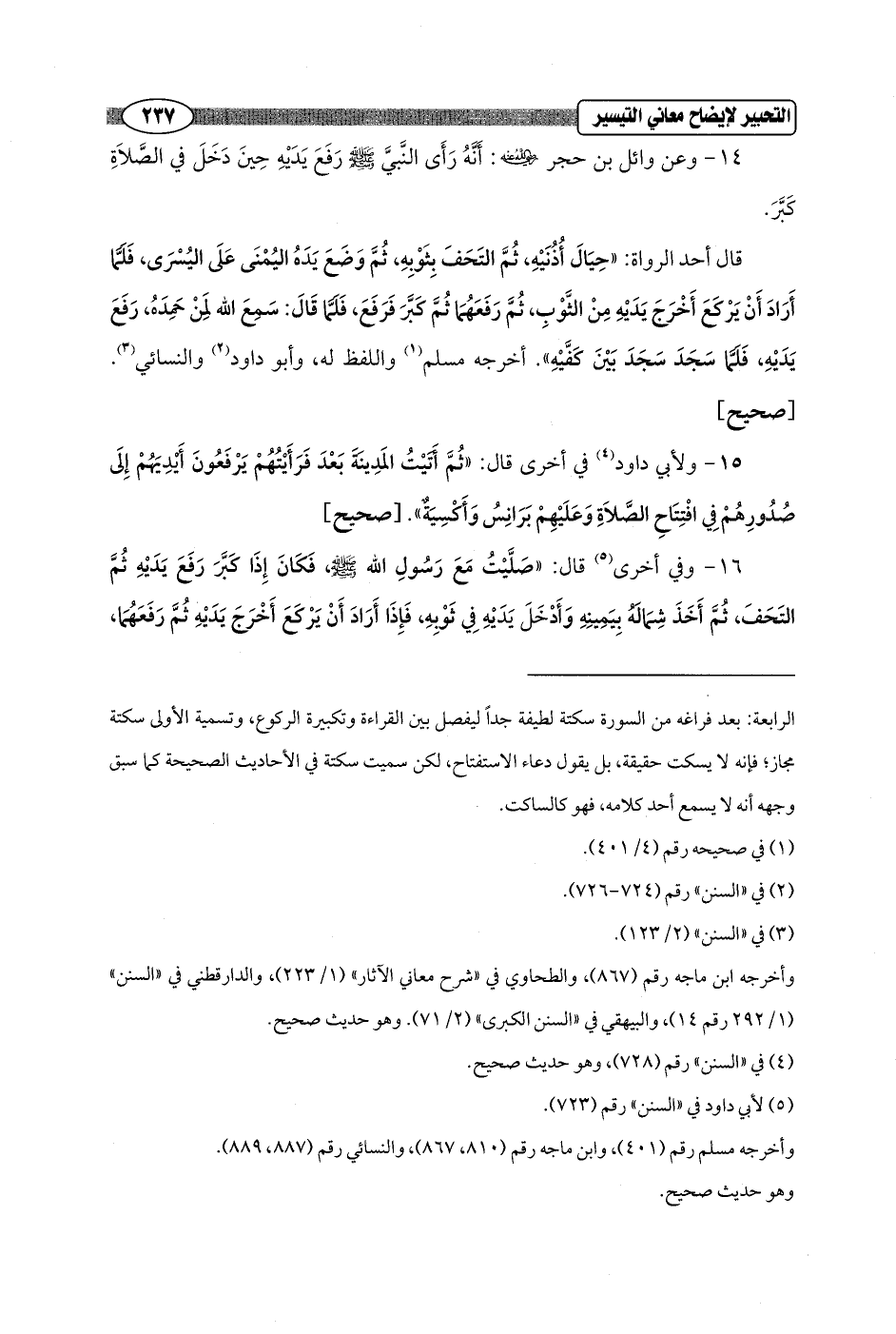 14 - وعن وائل بن حجر - رضي الله عنه -: أَنَّهُ رَأَى النَّبيَّ - صلى الله عليه وسلم - رَفَعَ يَدَيْهِ حِينَ دَخَلَ في الصَّلاَةِ كَبَّرَ.