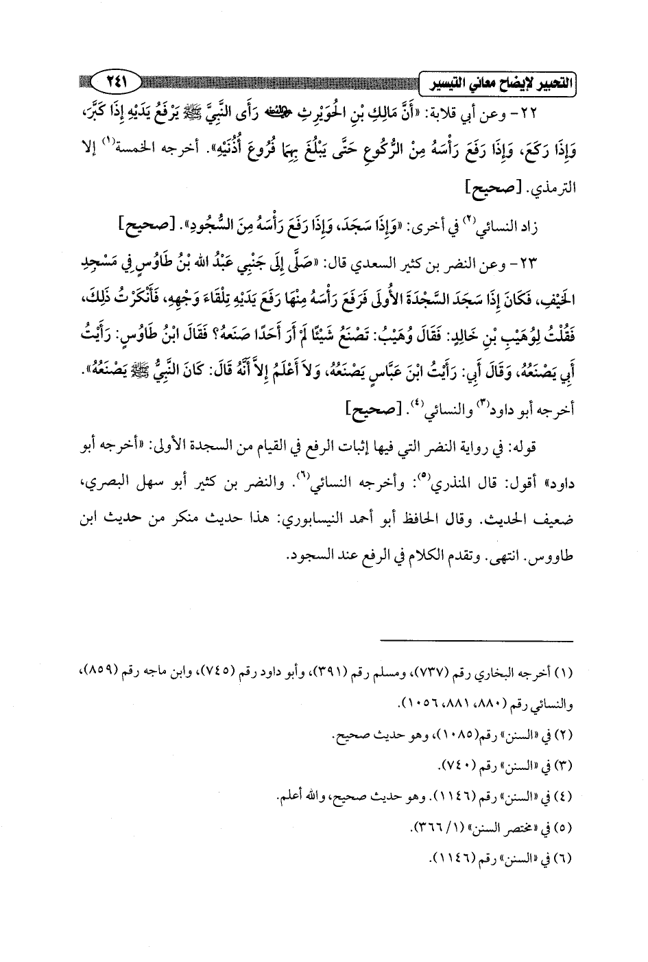 23 - وعن النضر بن كثير السعدي قال: "صَلَّى إِلَى جَنْبِي عَبْدُ الله بْنُ طَاوُسٍ فِي مَسْجِدِ الخَيْفِ, فَكَانَ إِذَا سَجَدَ السَّجْدَةَ الأُولَى فَرَفَعَ رَأْسَهُ منْهَا رَفَعَ يَدَيْهِ تِلْقَاءَ وَجْهِهِ, فَأَنْكَرْتُ ذَلِكَ، فَقُلْتُ لِوُهَيْبِ بْنِ خَالِدٍ: فَقَالَ وُهَيْبُ: تَصْنَعُ شَيْئًا لَمْ أَرَ أَحدًا صَنَعهُ؟ فَقَالَ ابْنُ طَاوُسٍ: رَأَيْتُ أَبِي يَصْنَعُهُ, وَقَالَ أَبِي: رَأَيْتُ ابْنَ عَبَّاسٍ يَصْنَعُهُ، وَلاَ أَعْلَمُ إِلاَّ أَنَّهُ قَالَ: كَانَ النَّبِيُّ - صلى الله عليه وسلم - يصْنَعُهُ". أخرجه أبو داود (¬3) والنسائي (¬4). [صحيح]