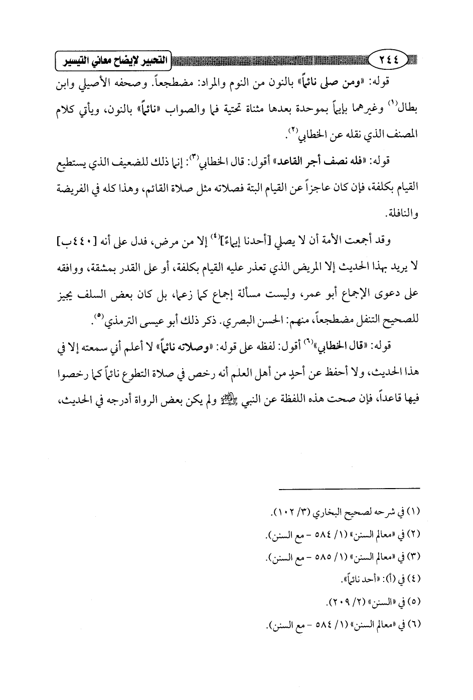 قوله: "قال الخطابي" (¬6) أقول: لفظه على قوله: "وصلاته نائماً" لا أعلم أني سمعته إلا في هذا الحديث، ولا أحفظ عن أحدٍ من أهل العلم أنه رخص في صلاة التطوع نائماً كما رخصوا فيها قاعداً، فإن صحت هذه اللفظة عن النبي - صلى الله عليه وسلم - ولم يكن بعض الرواة أدرجه في الحديث،