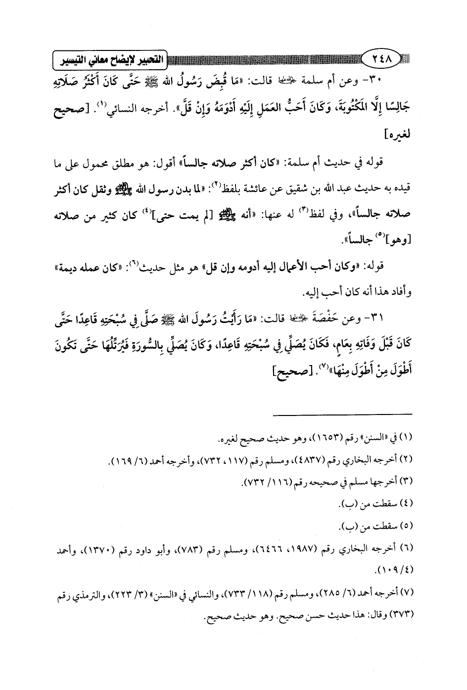 30 - وعن أم سلمة - رضي الله عنها - قالت: "مَا قُبِضَ رَسُولُ الله - صلى الله عليه وسلم - حَتَّى كَانَ أَكْثَرُ صَلَاتِهِ جَالِسًا إِلا المَكْتُوبَةَ, وَكَانَ أَحَبُّ العَمَلِ إِلَيْهِ أَدْوَمَهُ وَإِنْ قَلَّ". أخرجه النسائي (¬1). [صحيح لغيره]
