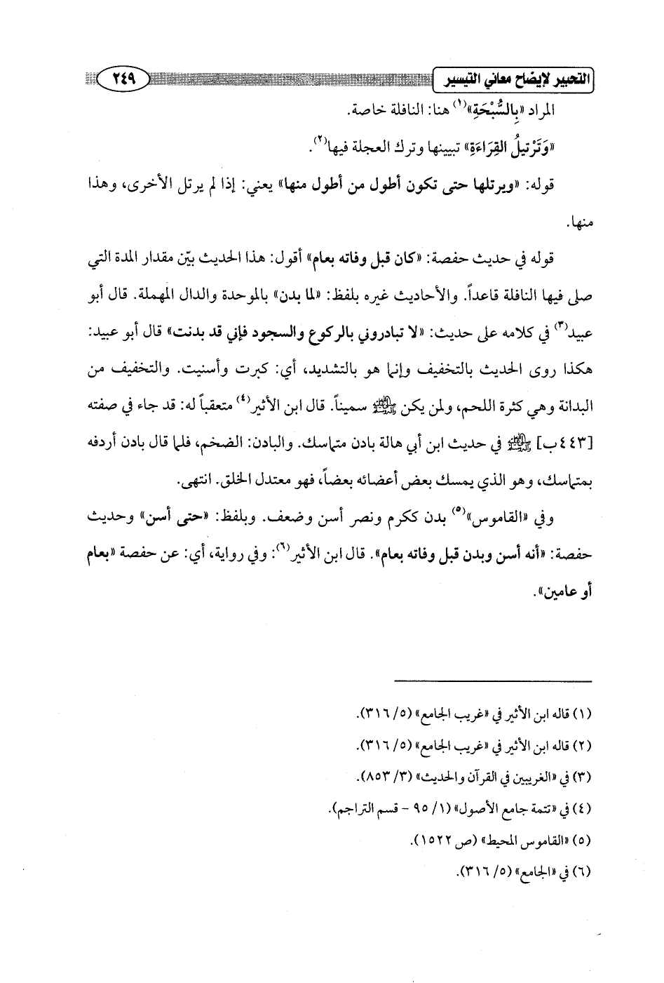 قوله في حديث حفصة: "كان قبل وفاته بعام" أقول: هذا الحديث بيّن مقدار المدة التي صلى فيها النافلة قاعداً. والأحاديث غيره بلفظ: "لما بدن" بالموحدة والدال المهملة. قال أبو عبيد (¬3) في كلامه على حديث: "لا تبادروني بالركوع والسجود فإني قد بدنت" قال أبو عبيد: هكذا روى الحديث بالتخفيف وإنما هو بالتشديد، أي: كبرت وأسنيت. والتخفيف من البدانة وهي كثرة اللحم، ولم يكن - صلى الله عليه وسلم - سميناً. قال ابن الأثير (¬4) متعقباً له: قد جاء في صفته [443 ب]- صلى الله عليه وسلم - في حديث ابن أبي هالة بادن متماسك. والبادن: الضخم، فلما قال بادن أردفه بمتماسك، وهو الذي يمسك بعض أعضائه بعضاً، فهو معتدل الخلق. انتهى.