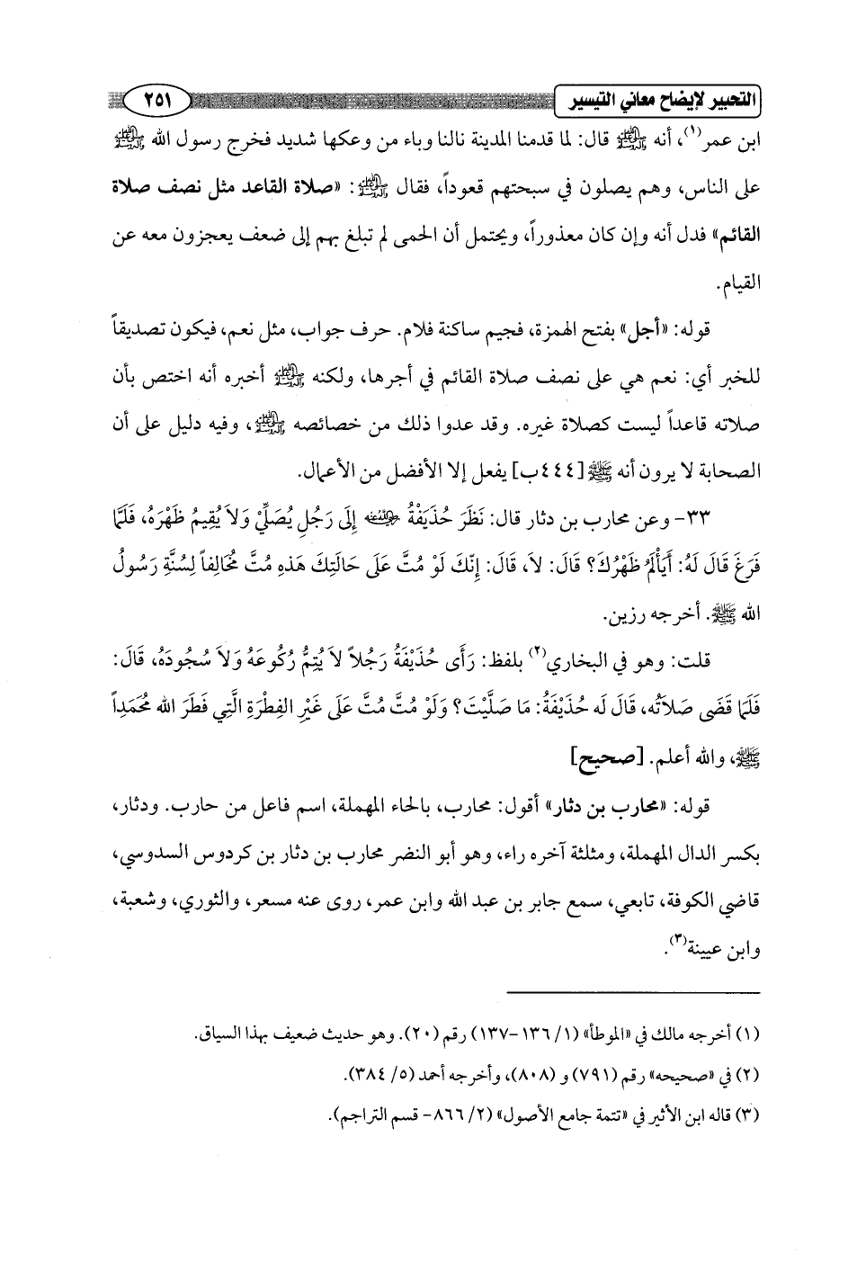 33 - وعن محارب بن دثار قال: نَظَرَ حُذَيَفْة - رضي الله عنه - إِلَى رَجُلِ يُصَلِّيْ وَلاَ يُقِيمُ ظَهْرهُ فَلَمَّا فَرَغَ قَالَ لَهُ: أَيأْلَمُ ظَهْرُكَ؟ قَالَ: لاَ، قَالَ: إِنّكَ لَوْ مُتَّ عَلَى حَالَتِكَ هَذهِ مُتَّ مُخَالِفاً لِسُنَّةِ رَسُولُ الله - صلى الله عليه وسلم -. أخرجه رزين.