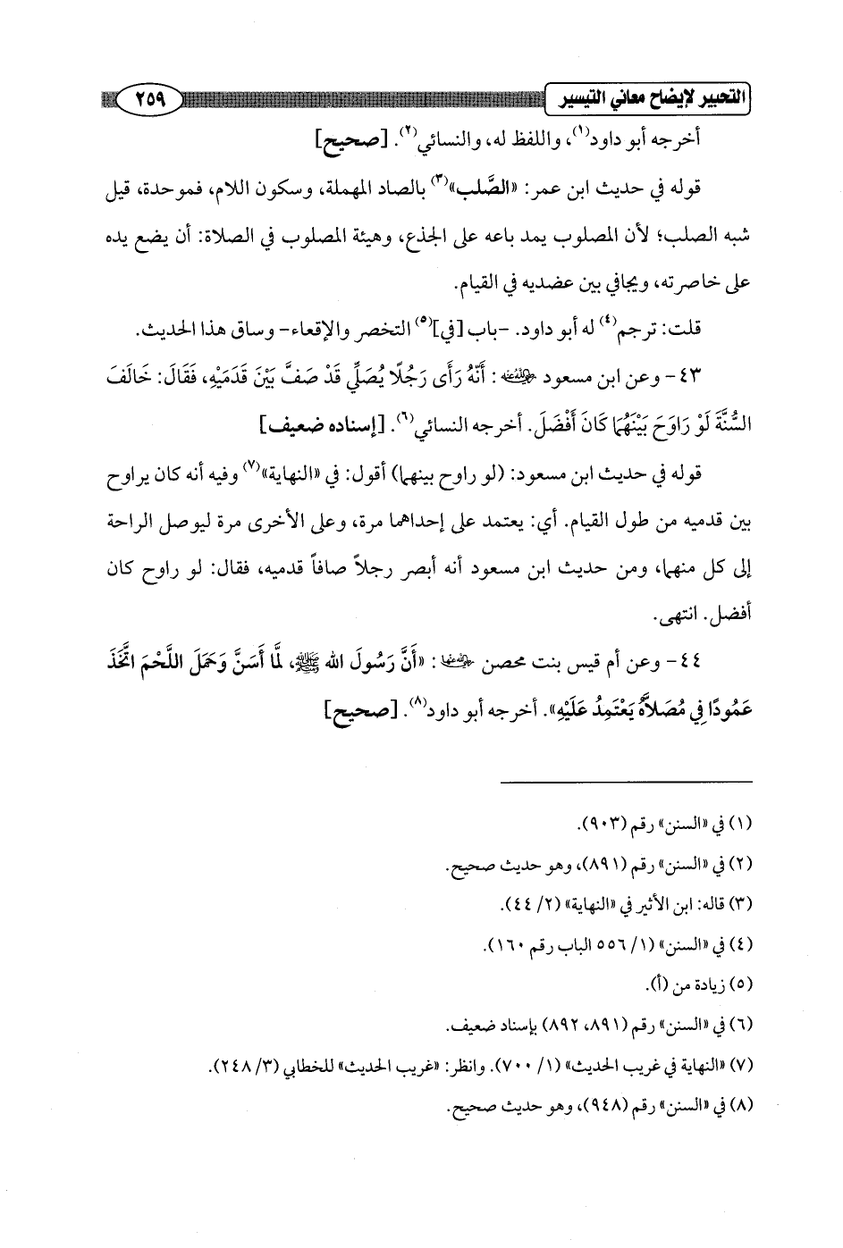 43 - وعن ابن مسعود - رضي الله عنه -: أَنّهُ رَأَى رَجُلًا يُصَلِّي قَدْ صَفَّ بَيْنَ قَدَمَيْهِ، فَقَالَ: خَالَفَ السُّنَّةَ لَوْ رَاوَحَ بَيْنَهُمَا كَانَ أَفْضَلَ. أخرجه النسائي (¬6). [إسناده ضعيف]
