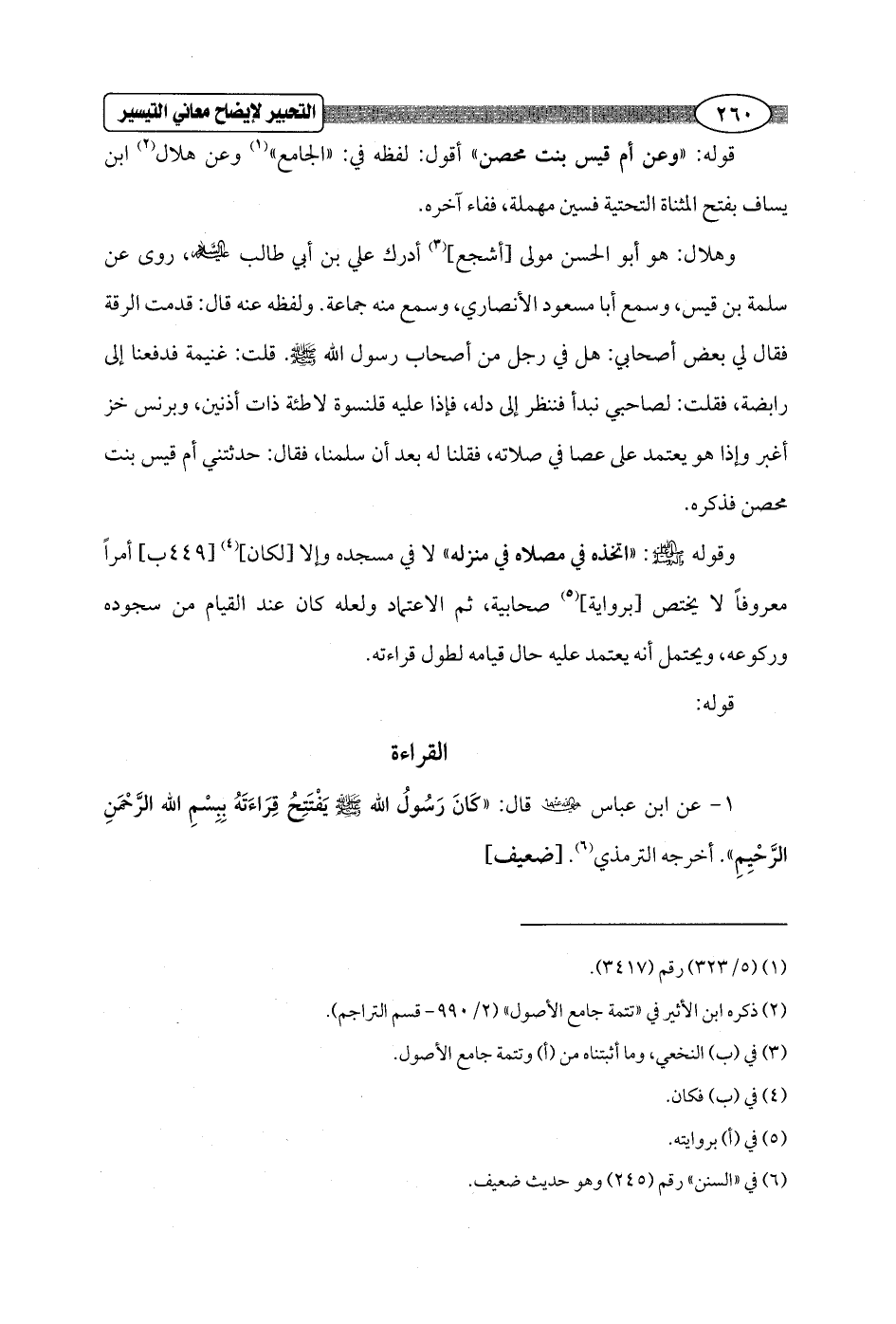 1 - عن ابن عباس - رضي الله عنهما - قال: "كانَ رَسُولُ الله - صلى الله عليه وسلم - يَفْتَتِحُ قِرَاءَتَهُ بِبِسْمِ الله الرَّحْمَنِ الرَّحْيِمِ". أخرجه الترمذي (¬6). [ضعيف]