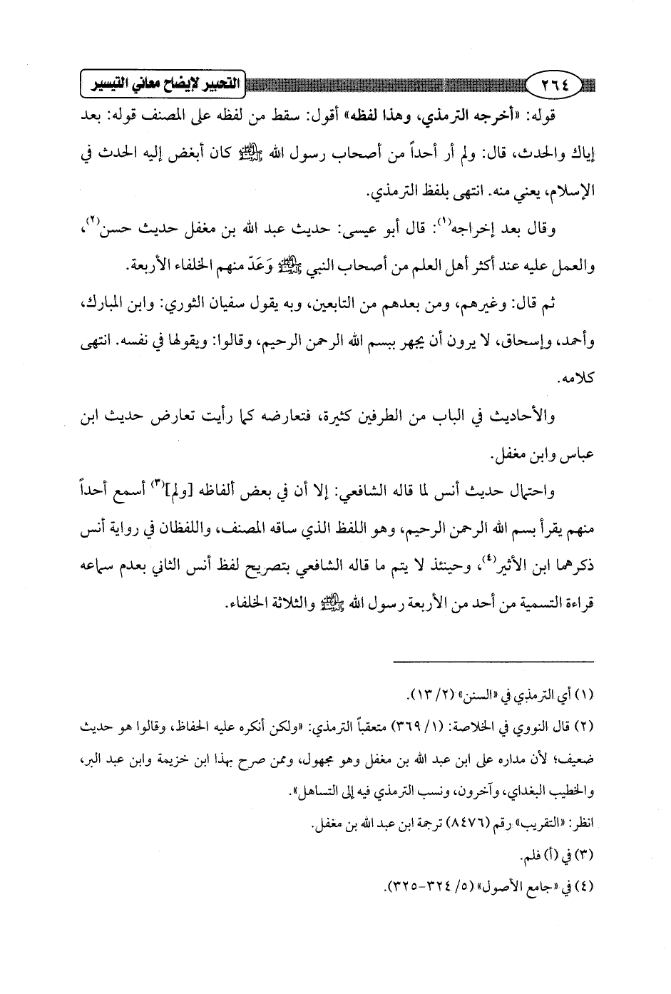 (¬2) قال النووي في الخلاصة: (1/ 369) متعقباً الترمذي: "ولكن أنكره عليه الحفاظ، وقالوا هو حديث ضعيف؛ لأن مداره على ابن عبد الله بن مغفل وهو مجهول, وممن صرح بهذا ابن خزيمة وابن عبد البر، والخطيب البغدادي، وآخرون، ونسب الترمذي فيه إلى التساهل".