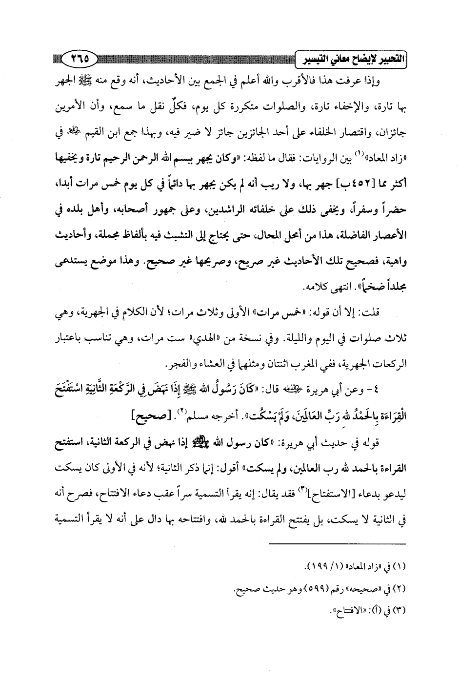 وإذا عرفت هذا فالأقرب والله أعلم في الجمع بين الأحاديث، أنه وقع منه - صلى الله عليه وسلم - الجهر بها تارة، والإخفاء تارة, والصلوات متكررة كل يوم، فكلٌ نقل ما سمع، وأن الأمرين جائزان، واقتصار الخلفاء على أحد الجائزين جائز لا ضير فيه, وبهذا جمع ابن القيم - رحمه الله - في "زاد المعاد" (¬1) بين الروايات: فقال ما لفظه: "وكان يجهر ببِسْمِ اللَّهِ الرَّحْمَنِ الرَّحِيمِ تارة ويخفيها أكثر مما [452 ب] جهر بها، ولا ريب أنه لم يكن يجهر بها دائماً في كل يوم خمس مرات أبدا، حضراً وسفراً، ويخفي ذلك على خلفائه الراشدين، وعلما جمهور أصحابه, وأهل بلده في الأعصار الفاضلة, هذا من أمحل المحال، حتى يحتاج إلى التشبث فيه بألفاظ مجملة, وأحاديث واهية، فصحيح تلك الأحاديث غير صريح، وصريحها غير صحيح. وهذا موضع يستدعى مجلداً ضخماً". انتهى كلامه.