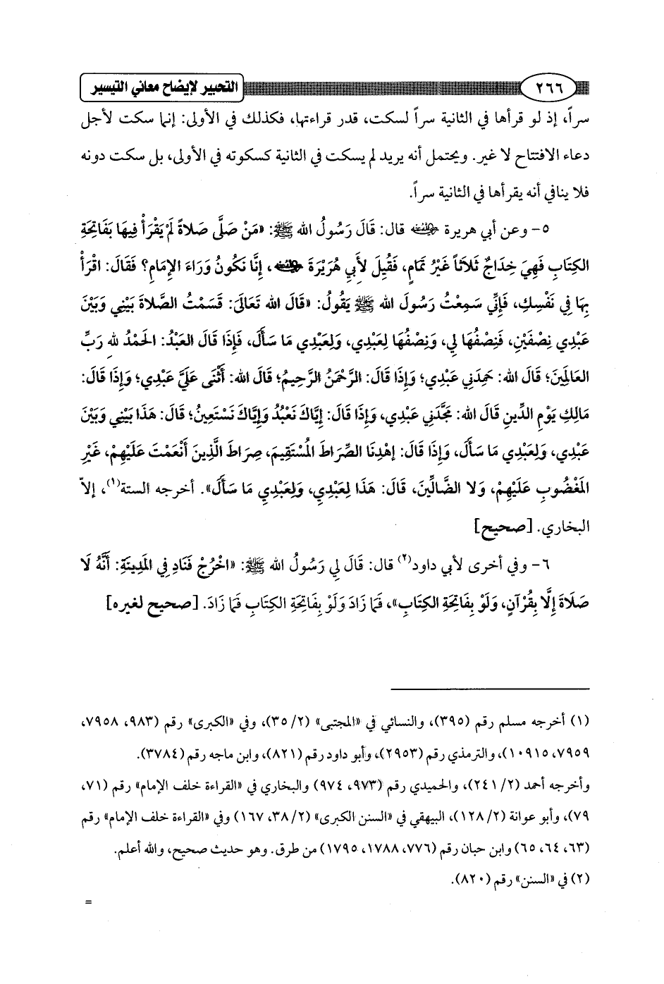 (¬1) أخرجه مسلم رقم (395)، والنسائي في "المجتبى" (2/ 35)، وفي "الكبرى" رقم (983، 7958، 7959، 10915)، والترمذي رقم (2953) , وأبو داود رقم (821)، وابن ماجه رقم (3784). وأخرجه أحمد (2/ 241)، والحميدي رقم (973، 974) والبخاري في "القراءة خلف الإمام" رقم (71, 79) , وأبوعوانة (2/ 128)، البيهقي في "السنن الكبرى" (2/ 38، 167) وفي "القراءة خلف الإمام" رقم (63، 64، 65) وابن حبان رقم (776، 1788، 1795) من طرق. وهو حديث صحيح، والله أعلم.