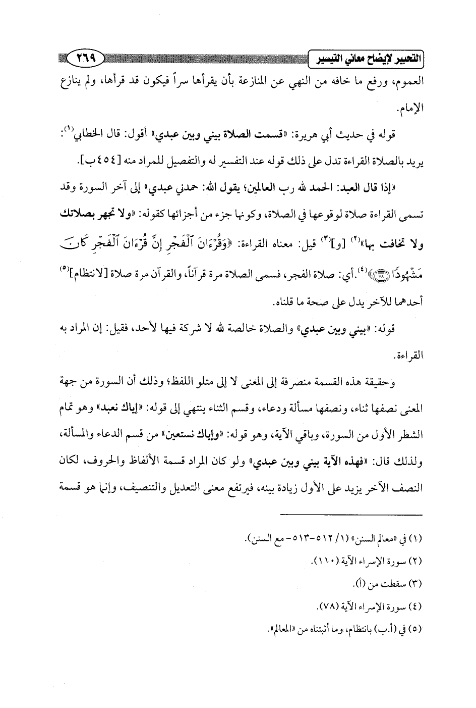 "إذا قال العبد: الحمد لله رب العالمين؛ يقول الله: حمدني عبدي" إلى آخر السورة وقد تسمى القراءة صلاة لوقوعها في الصلاة, وكونها جزء من أجزائها كقوله: "ولا تجهر بصلاتك ولا تخافت بها" (¬2) [و] (¬3) قيل: معناه القراءة: {وَقُرْآنَ الْفَجْرِ إِنَّ قُرْآنَ الْفَجْرِ كَانَ مَشْهُودًا (78)} (¬4). أي: صلاة الفجر، فسمى الصلاة مرة قرآناً، والقرآن مرة صلاة [لانتظام] (¬5) أحدهما للآخر يدل على صحة ما قلناه.