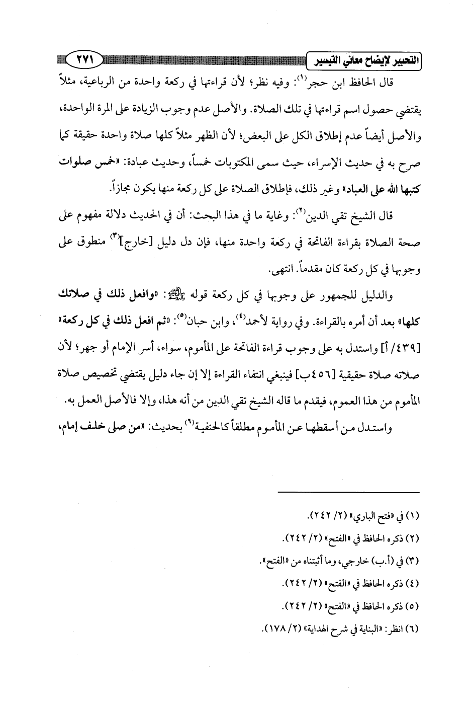 قال الحافظ ابن حجر (¬1): وفيه نظر؛ لأن قراءتها في ركعة واحدة من الرباعية، مثلاً يقتضي حصول اسم قراءتها في تلك الصلاة. والأصل عدم وجوب الزيادة على المرة الواحدة، والأصل أيضاً عدم إطلاق الكل على البعض؛ لأن الظهر مثلاً كلها صلاة واحدة حقيقة كما صرح به في حديث الإسراء، حيث سمى المكتوبات خمساً، وحديث عبادة: "خمس صلوات كتبها الله على العباد" وغير ذلك، فإطلاق الصلاة على كل ركعة منها يكون مجازاً.