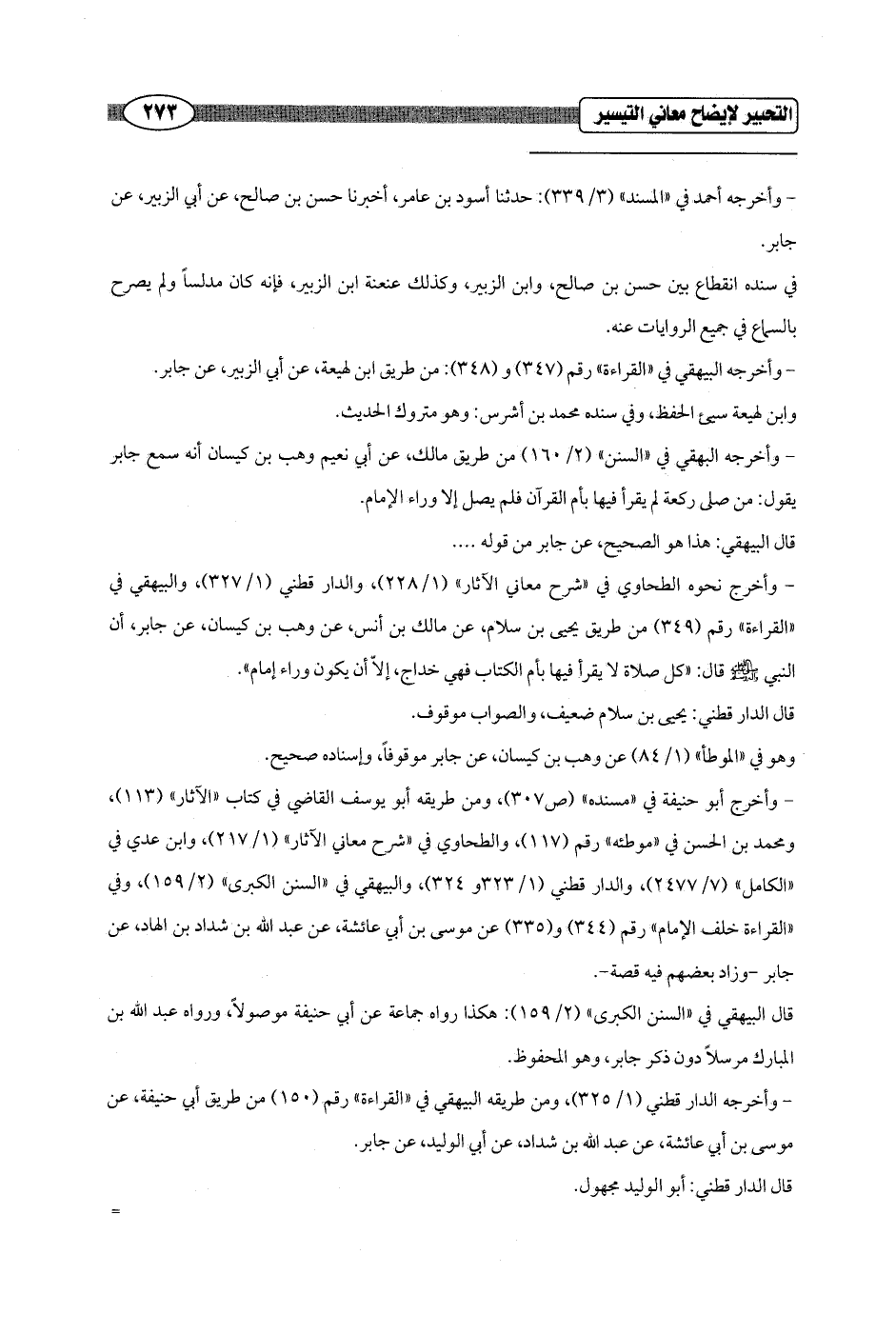 - وأخرجه الدارقطني (1/ 325)، ومن طريقه البيهقي في "القراءة" رقم (150) من طريق أبي حنيفة، عن موسى بن أبي عائشة، عن عبد الله بن شداد، عن أبي الوليد، عن جابر.