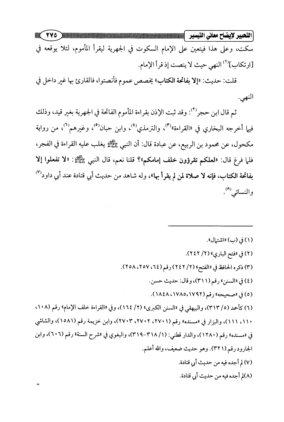 (¬6) كأحمد (5/ 313)، والبيهقي في "السنن الكبرى" (2/ 164)، وفي "القراءة خلف الإمام" رقم (108، 110، 111)، والبزار في "مسنده" رقم (2701، 2702، 2703)، وابن خزيمة رقم (1581)، والشاشي في "مسنده" رقم (1280)، والدارقطني: (1/ 318 - 319)، والبغوي في "شرح السنة" رقم (606)، وابن الجارود رقم (321). وهو حديث ضعيف، والله أعلم.