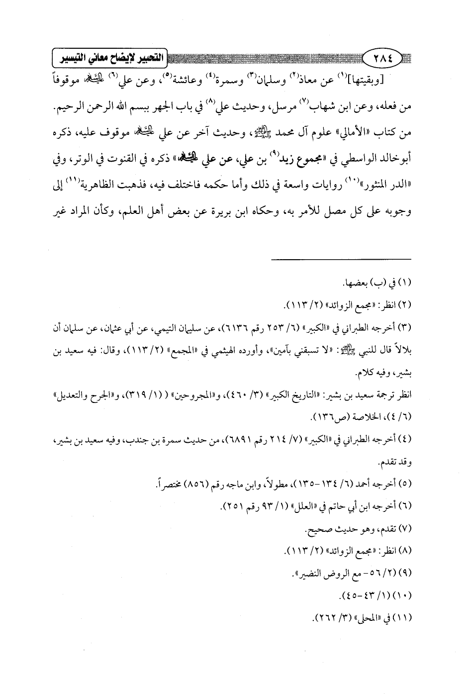 [وبقيتها] (¬1) عن معاذ (¬2) وسلمان (¬3) وسمرة (¬4) وعائشة (¬5)، وعن علي (¬6) - عليه السلام - موقوفاً من فعله، وعن ابن شهاب (¬7) مرسل، وحديث علي (¬8) في باب الجهر ببِسْمِ اللَّهِ الرَّحْمَنِ الرَّحِيمِ. من كتاب "الأمالي" علوم آل محمد - صلى الله عليه وسلم -، وحديث آخر عن علي - عليه السلام - موقوف عليه، ذكره أبو خالد الواسطي في "مجموع زيد" (¬9) بن علي، عن علي - عليه السلام -" ذكره في القنوت في الوتر، وفي "الدر المنثور" (¬10) روايات واسعة في ذلك وأما حكمه فاختلف فيه، فذهبت الظاهرية (¬11) إلى وجوبه على كل مصل للأمر به، وحكاه ابن بريرة عن بعض أهل العلم، وكأن المراد غير