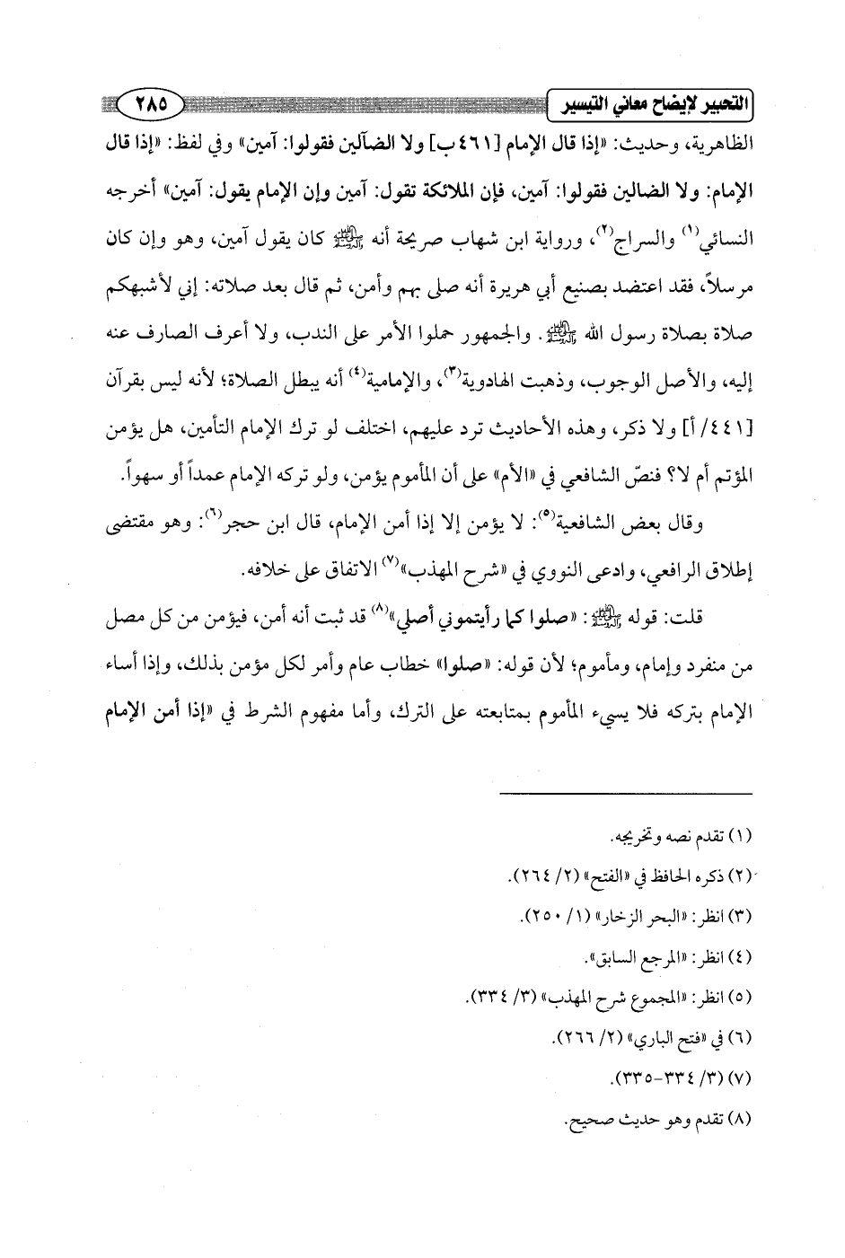الظاهرية, وحديث: "إذا قال الإمام [461 ب] ولا الضآلين فقولوا: آمين" وفي لفظ: "إذا قال الإمام: ولا الضالين فقولوا: آمين، فإن الملائكة تقول: آمين وإن الإمام يقول: آمين" أخرجه النسائي (¬1) والسراج (¬2)، ورواية ابن شهاب صريحة أنه - صلى الله عليه وسلم - كان يقول آمين, وهو وإن كان مرسلاً، فقد اعتضد بصنيع أبي هريرة أنه صلى بهم وأمن، ثم قال بعد صلاته: إني لأشبهكم صلاة بصلاة رسول الله - صلى الله عليه وسلم -. والجمهور حملوا الأمر على الندب، ولا أعرف الصارف عنه إليه، والأصل الوجوب، وذهبت الهادوية (¬3)، والإمامية (¬4) أنه يبطل الصلاة؛ لأنه ليس بقرآن [441/ أ] ولا ذكر، وهذه الأحاديث ترد عليهم، اختلف لو ترك الإمام التأمين، هل يؤمن المؤتم أم لا؟ فنصّ الشافعي في "الأم" على أن المأموم يؤمن، ولو تركه الإمام عمداً أو سهواً.