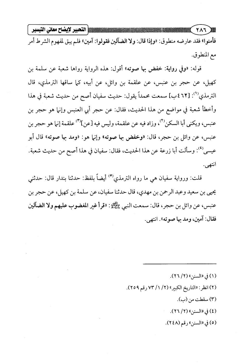 قلت: ورواية سفيان هي ما رواه الترمذي (¬5) أيضاً بلفظ: حدثنا بندار قال: حدثني يحيى بن سعيد وعبد الرحمن بن مهدي، قال حدثنا سفيان، عن سلمة بن كهيل، عن حجر بن عنبس، عن وائل بن حجر، قال: سمعت النبي - صلى الله عليه وسلم -: "قرأ غير المغضوب عليهم ولا الضآلين فقال: آمين، ومد بها صوته". انتهى.