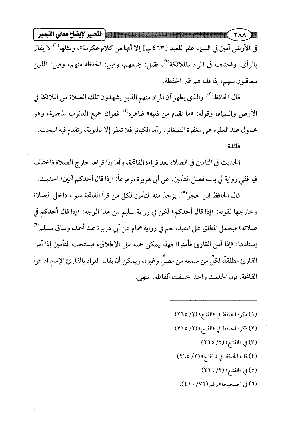 في الأرض آمين في السماء غفر للعبد [463 ب] إلا أنها من كلام عكرمة"، ومثلها (¬1) لا يقال بالرأي: واختلف في المراد بالملائكة (¬2)، فقيل: جميعهم، وقيل: الحفظة منهم، وقيل: الذين يتعاقبون منهم، إذا قلنا هم غير الحفظة.
