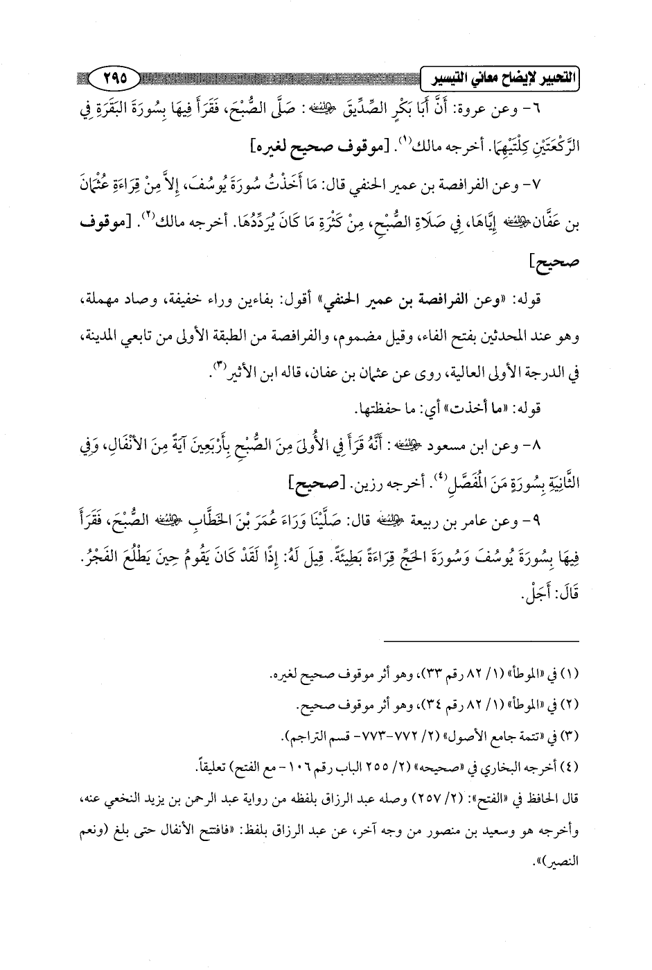 7 - وعن الفرافصة بن عمير الحنفي قال: مَا أَخَذْتُ سُورَةَ يُوسُفَ، إِلاَّ مِنْ قِرَاءَةِ عُثْمَانَ بن عَفَّان - رضي الله عنه - إِيَّاهَا، فِي صَلَاةِ الصُّبْحِ، مِنْ كَثْرَةِ مَا كَانَ يُرَدَّدُهَا. أخرجه مالك (¬2). [موقوف صحيح]
