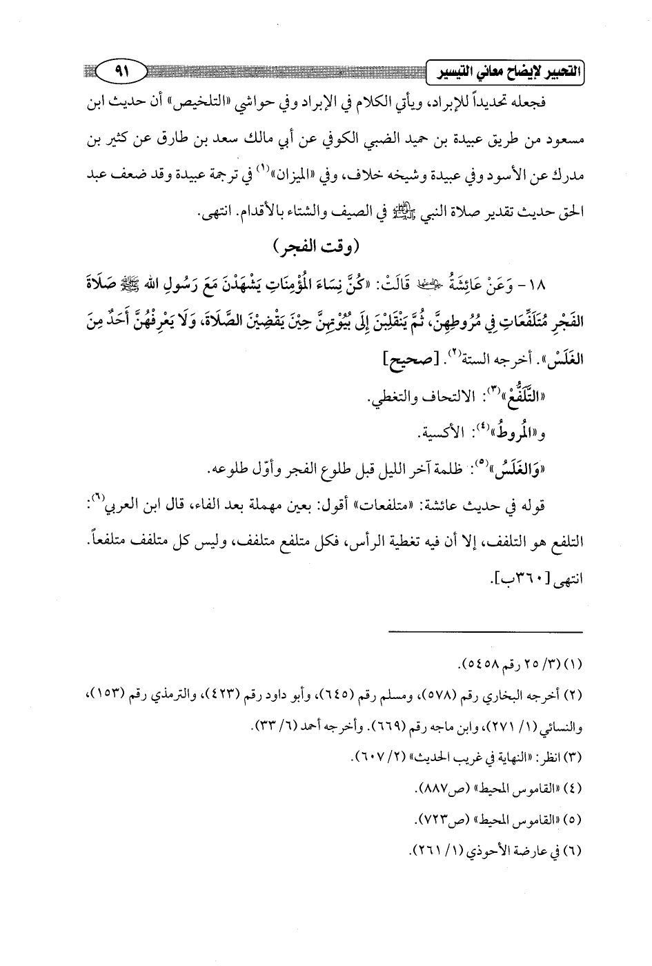 18 - وَعَنْ عَائِشَةُ - رضي الله عنها - قَالَتْ: "كُنَّ نِسَاءَ المُؤْمِنَاتِ يَشْهَدْنَ مَعَ رَسُولِ الله - صلى الله عليه وسلم - صَلَاةَ الفَجْرِ مُتَلَفِّعَاتِ فِي مُرُوطِهِنَّ، ثُمَّ يَنْقَلِبْنَ إِلَى بُيُوْتِهِنَّ حِيْنَ يَقْضينَ الصَّلَاةَ, وَلَا يَعْرِفْهُنَّ أَحَدٌ مِنَ الغَلَسْ". أخرجه الستة (¬2). [صحيح]