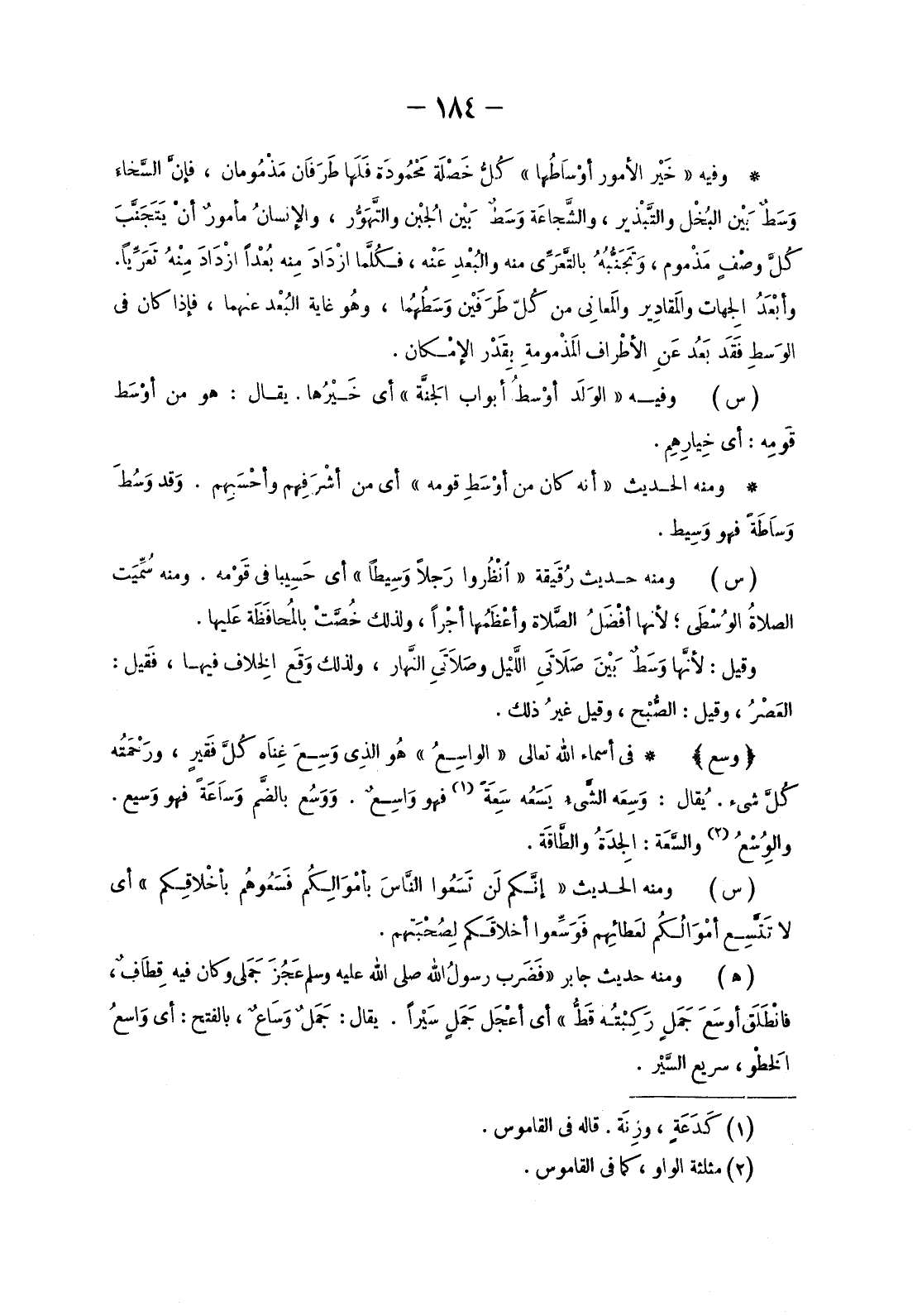 وَفِيهِ «خَيْر الْأُمُورِ أَوْسَاطُهَا» كُلُّ خَصْلَة مَحْمُودَة فَلَها طَرَفَان مَذْمُومان، فإنَّ السَّخاءَ وَسَطٌ بَيْن البُخْل والتَّبْذير، والشَّجاعَة وَسَطٌ بَيْن الجُبن والتَّهَوُّر، والإنسانُ مأمورٌ أنْ يَتَجَنَّبَ كُلَّ وَصْفٍ مَذْموم، وَتَجَنُّبُه بالتَّعَرِّي مِنْهُ والبُعدِ عَنْه، فكُلَّما ازْدَادَ مِنه بُعْداً ازْدادَ مِنْهُ تَعَرِّياً.