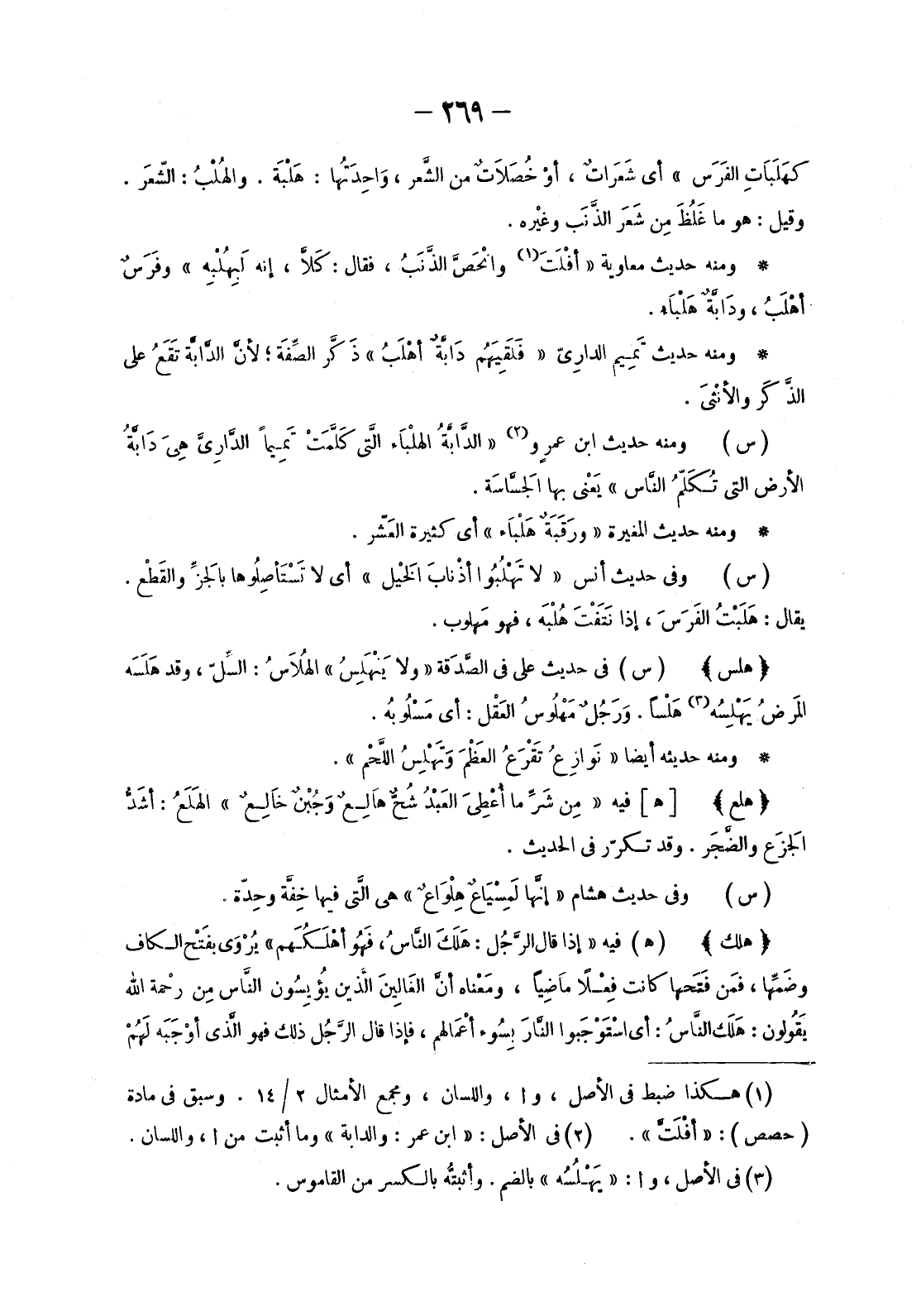 وَمِنْهُ حَدِيثُ مُعَاوِيَةَ «أفْلَتَ «1» وانْحَصَّ الذَّنَبُ، فَقَالَ: كَلا، إِنَّهُ لَبِهُلْبِهِ» وفَرَسٌ أَهْلَبُ، ودَابَّةٌ هَلْبَاءُ.