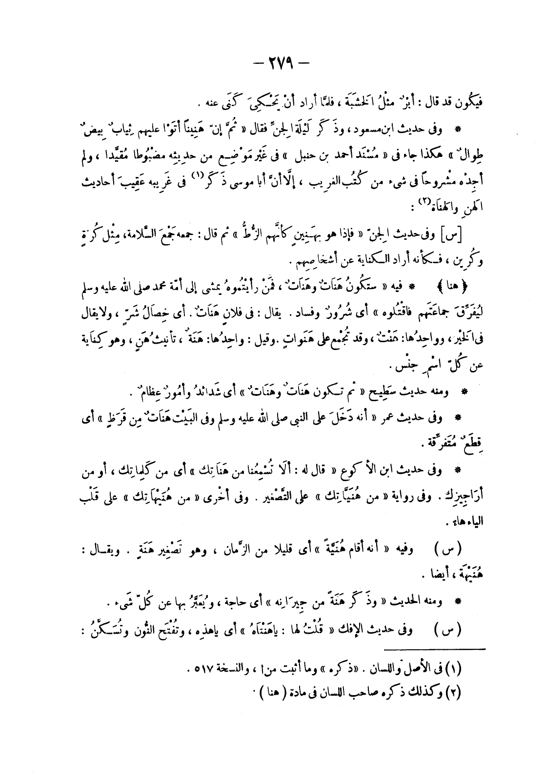 وَفِي حَدِيثِ ابْنِ مَسْعُودٍ، وذَكَر لَيْلَة الجِنِّ فَقَالَ «ثُمَّ إِنَّ هَنِيناً أتَوْا عَلَيْهِمْ ثِيابٌ بِيضٌ طِوالٌ» هَكَذَا جَاءَ فِي «مُسْنَد أَحْمَدَ بْنِ حَنْبَلٍ» فِي غَيْر مَوْضِع مِنْ حديثِه مضْبُوطا مُقيَّدا، وَلَمْ أجِدْه مشْروحاً فِي شَيْءٍ مِنْ كُتُب الغرِيب، إِلَّا أنَّ أَبَا مُوسَى ذَكَر «1» فِي غَرِيبه عَقيبَ أَحَادِيثِ الهَنِ والهَنَاة «2» :