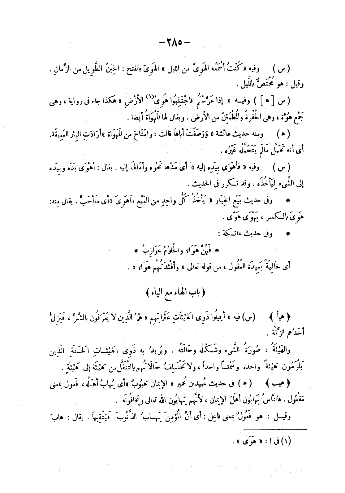 (س [هـ] ) وَفِيهِ «إِذَا عَرَّسْتُم فاجْتَنِبُوا هُوِىَّ «1» الأرضِ» هَكَذَا جَاءَ فِي رِوَايَةٍ، وَهِيَ جَمْع هُوَّة، وَهِيَ الحُفْرةُ والمُطْمَئِنّ مِنَ الْأَرْضِ. وَيُقَالُ لَهَا الْمَهْوَاةُ أَيْضًا.