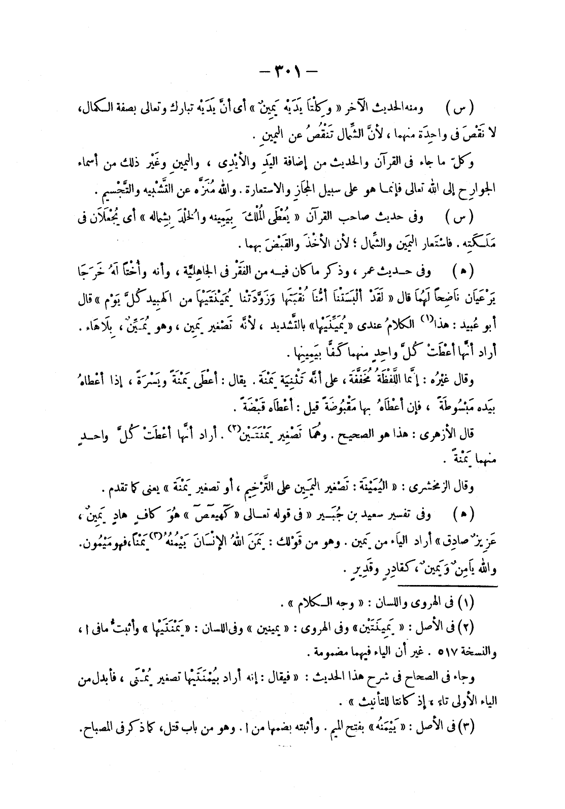 (2) في الأصل: «يَمِينَتَيْن» وفي الهروي: «يمينين» وفي اللسان: «يَمْنَتَيْها» وأثبتُّ ما في ا، والنسخة 517. غير أن الياء فيهما مضمومة. وجاء في الصحاح في شرح هذا الحديث: «فيقال: إنه أراد بيُمْنَتَيْها تصغير يُمْنَى، فأبدل من الياء الأولى تاءً، إذ كانتا للتأنيث» .