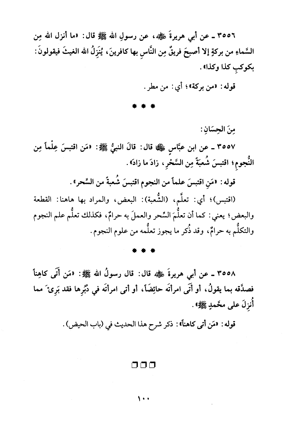 3556 - عن أبي هريرةَ - رضي الله عنه -، عن رسولِ الله - صلى الله عليه وسلم - قال: "ما أنزل الله مِن السَّماءِ من بركةٍ إلا أصبحَ فريقٌ مِن النَّاسِ بها كافرينَ، يُنَزِلُ الله الغيثَ فيقولونَ: بكوكبِ كذا وكذا".