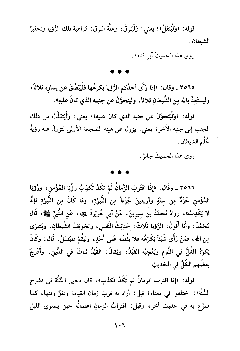 3566 - وقَال: "إِذَا اقتَربَ الزَّمانُ لَمْ تَكَدْ تَكذِبُ رؤُيَا المُؤْمنِ، ورُؤيَا المُؤْمنِ جُزْءٌ مِن سِتَّةٍ وأربَعِينَ جُزْءًا مِن النُّبوَّةِ، ومَا كَانَ مِن النُّبوَّةِ فإنَّه لا يَكْذِبُ"، رواهُ مُحمَّدُ بن سِيرِينَ، عَنْ أبي هُريْرةَ - رضي الله عنه -، عَنِ النَّبيِّ - صلى الله عليه وسلم -، قَال مُحَمَّدٌ: وأَنا أَقُولُ: الرُّؤيا ثَلاثٌ: حَدِيْثُ النَّفسِ، وتَخْوْيفُ الشَّيطانِ، وبُشرَى مِن الله، فمَنْ رَأَى شَيْئًا يَكْرَهُه فلا يقُصَّه عَلى أَحَدٍ، ولْيقُمْ فليُصَلِّ، قَال: وكَانَ يَكرَهُ الغُلَّ في النَّومِ ويُعْجبُه القَيْدُ، ويُقالُ: القَيْدُ ثباتٌ في الدِّينِ. وأَدْرجَ بعضُهم الكُلَّ في الحَديثِ.