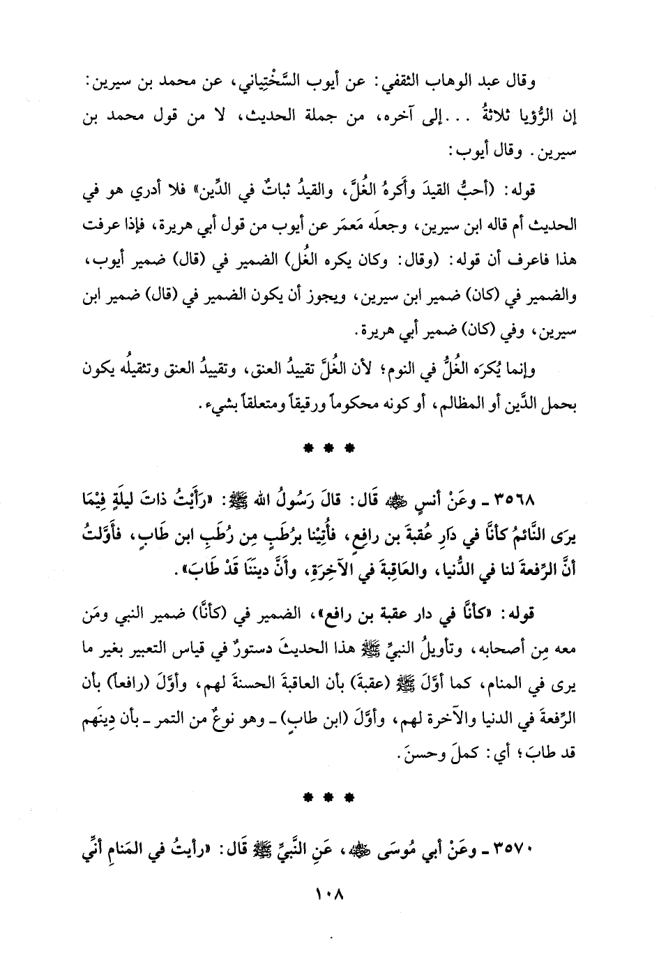 قوله: (أحبُّ القيدَ وأَكرهُ الغُلَّ، والقيدُ ثباتٌ في الدِّين" فلا أدري هو في الحديث أم قاله ابن سيرين، وجعلَه مَعمَر عن أيوب من قول أبي هريرة، فإذا عرفت هذا فاعرف أن قوله: (وقال: وكان يكره الغُل) الضمير في (قال) ضمير أيوب، والضمير في (كان) ضمير ابن سيرين، ويجوز أن يكون الضمير في (قال) ضمير ابن سيرين، وفي (كان) ضمير أبي هريرة.