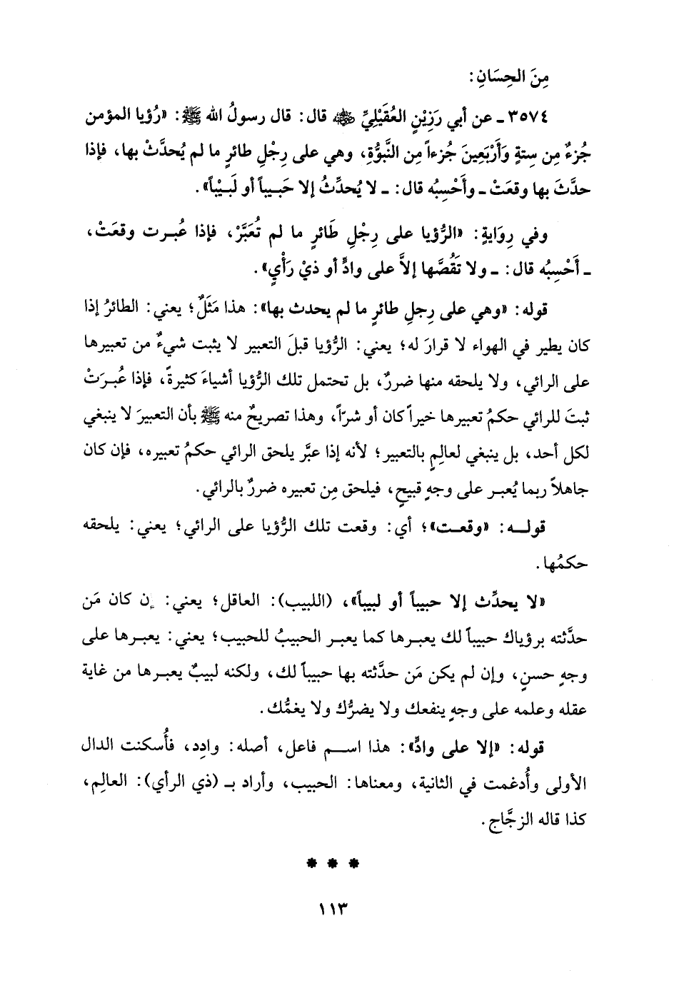 3574 - عن أبي رَزيْنٍ العُقَيْلِيِّ - رضي الله عنه - قال: قال رسولُ الله - صلى الله عليه وسلم -: "رُؤيا المؤمن جُزءٌ مِن سِتةٍ وَأَرْبَعِينَ جُزءًا مِن النَّبوُّةِ، وهي على رِجْلِ طائرٍ ما لم يُحدَّثْ بها، فإذا حدَّثَ بها وقعَتْ - وأَحْسِبُه قال: - لا يُحدِّثُ إلا حَبيبًا أو لَبيْبًا".