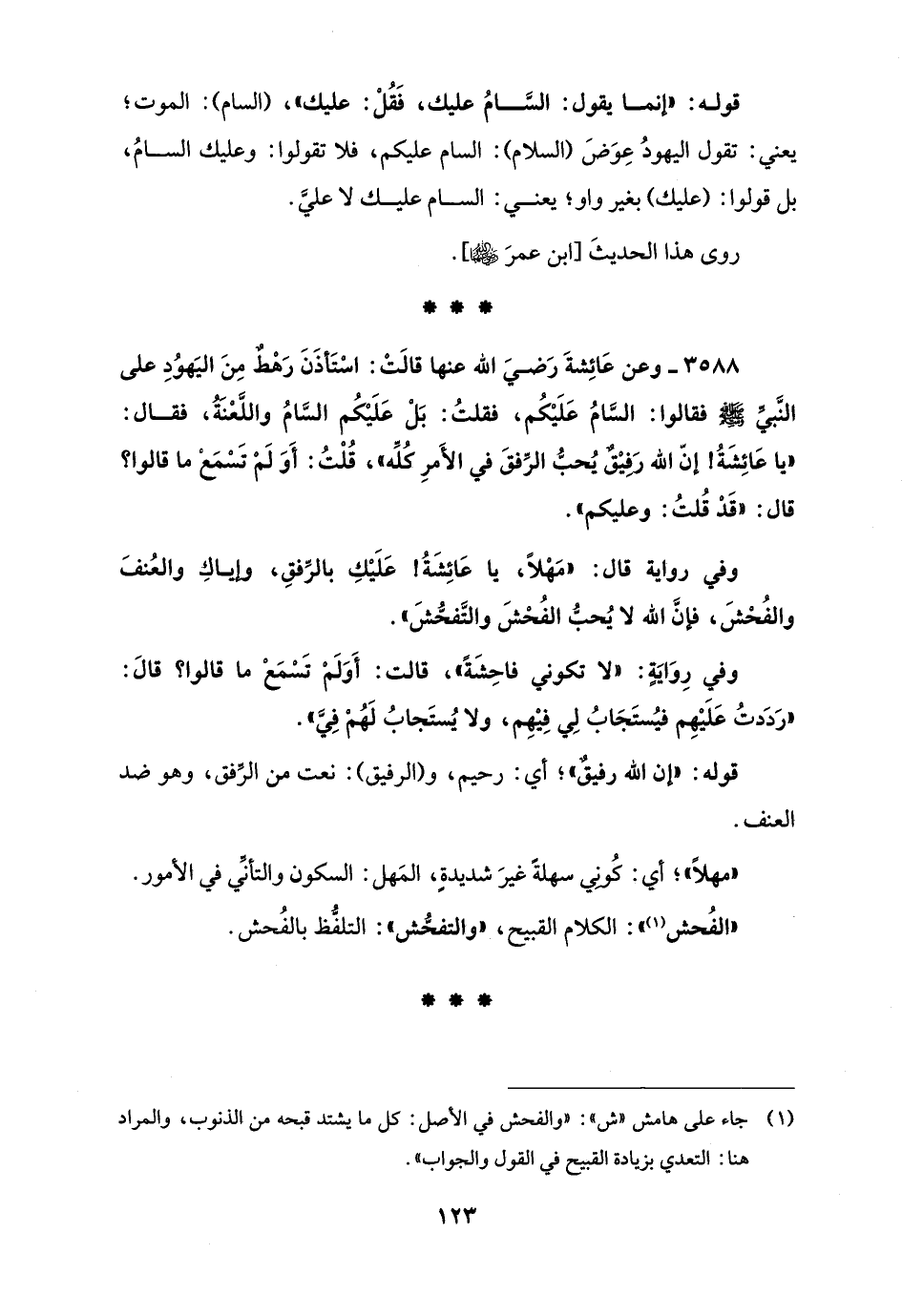3588 - وعن عَائِشةَ رَضيَ الله عنها قالَتْ: اسْتَأذَنَ رَهْطٌ مِنَ اليَهوُدِ على النَّبيِّ - صلى الله عليه وسلم - فقالوا: السَّامُ عَلَيْكُم، فقلتُ: بَلْ عَلَيْكُم السَّامُ واللَّعْنَةُ، فقال: "يا عَائِشَةُ! إنّ الله رَفِيْقٌ يُحبُّ الرِّفقَ في الأَمرِ كُلِّه"، قُلْتُ: أَوَ لَمْ تَسْمَعْ ما قالوا؟ قال: "قَدْ قُلتُ: وعليكم".