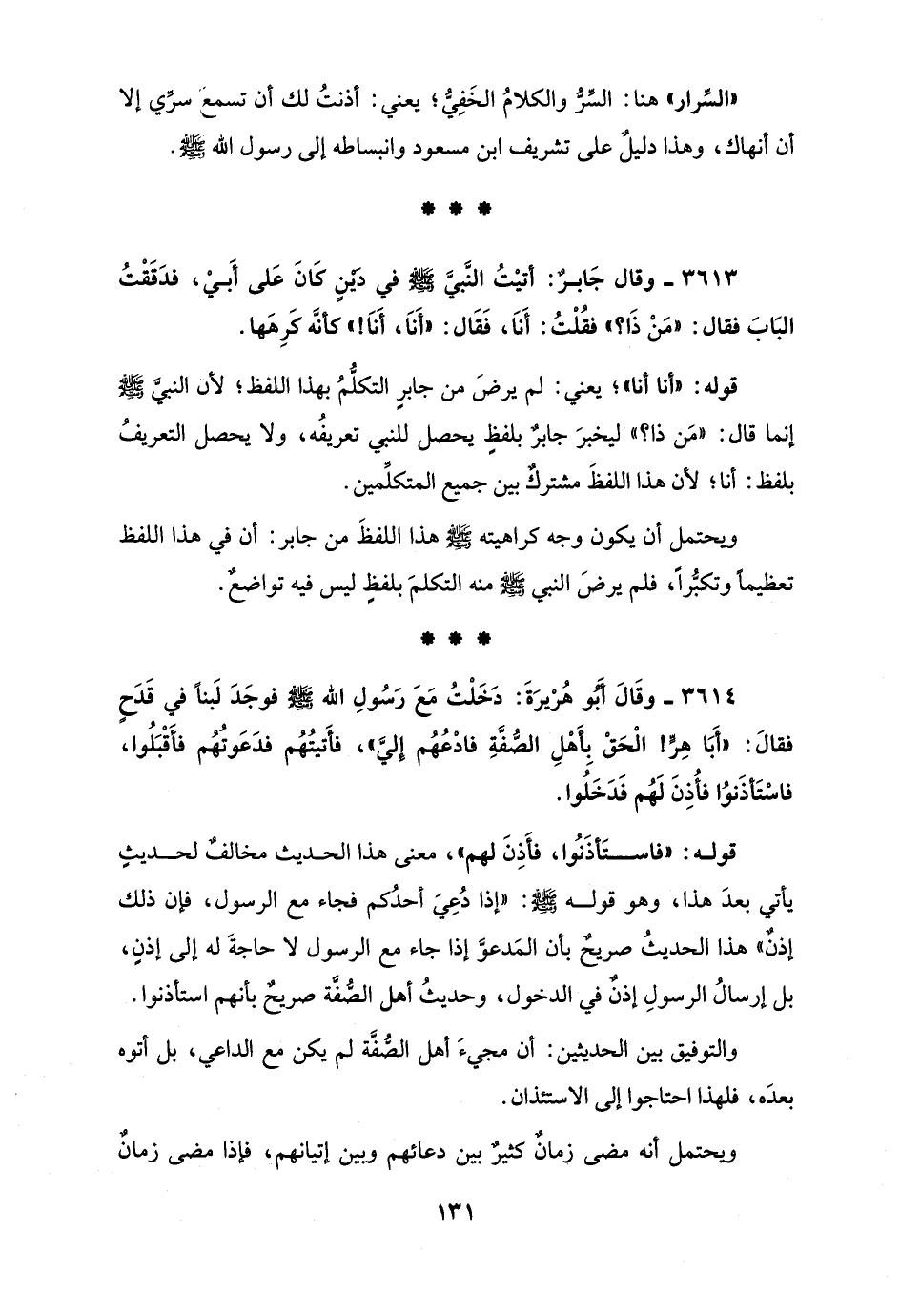 3613 - وقال جَابرٌ: أتيْتُ النَّبيَّ - صلى الله عليه وسلم - في دَيْنٍ كَانَ عَلى أَبيْ، فدَقَقْتُ البَابَ فقال: "مَنْ ذَا؟ " فقُلْتُ: أَنَا، فَقَال: "أَنَا، أَنَا! " كأنَّه كَرِهَها.