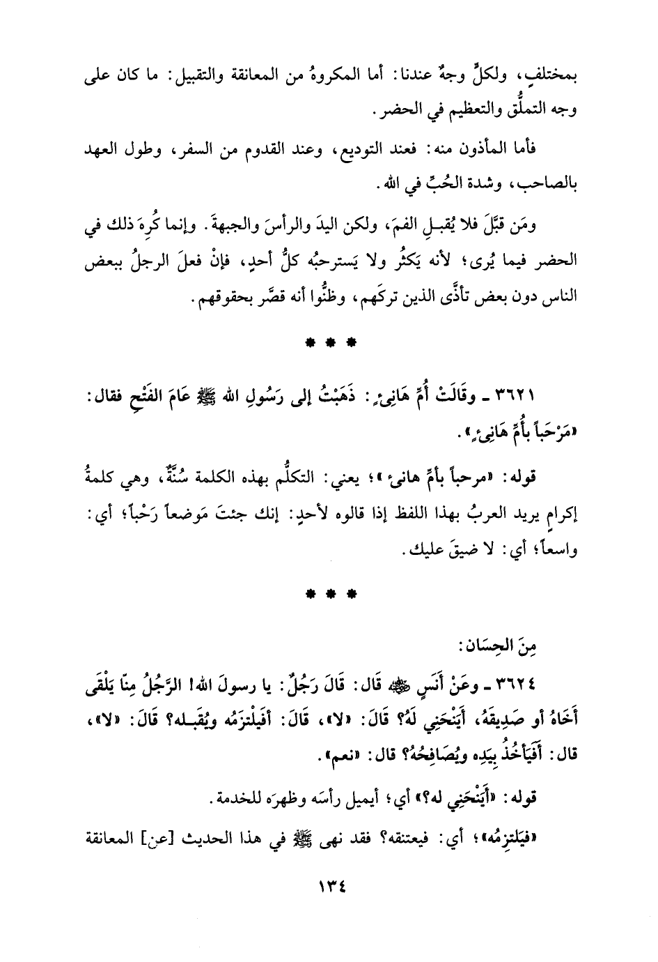 3624 - وعَنْ أَنَسٍ - رضي الله عنه - قَال: قَالَ رجل: يا رسولَ الله! الرَّجُلُ مِنّا يَلْقَى أَخَاهُ أو صَدِيقَهُ، أَيَنْحَنِي لَهُ؟ قَالَ: "لا"، قَالَ: أفَيلْتزَمُه ويُقَبله؟ قَالَ: "لا"، قال: أَفَيَأخُذُ بِيَدِهِ ويُصَافِحُهُ؟ قال: "نعم".