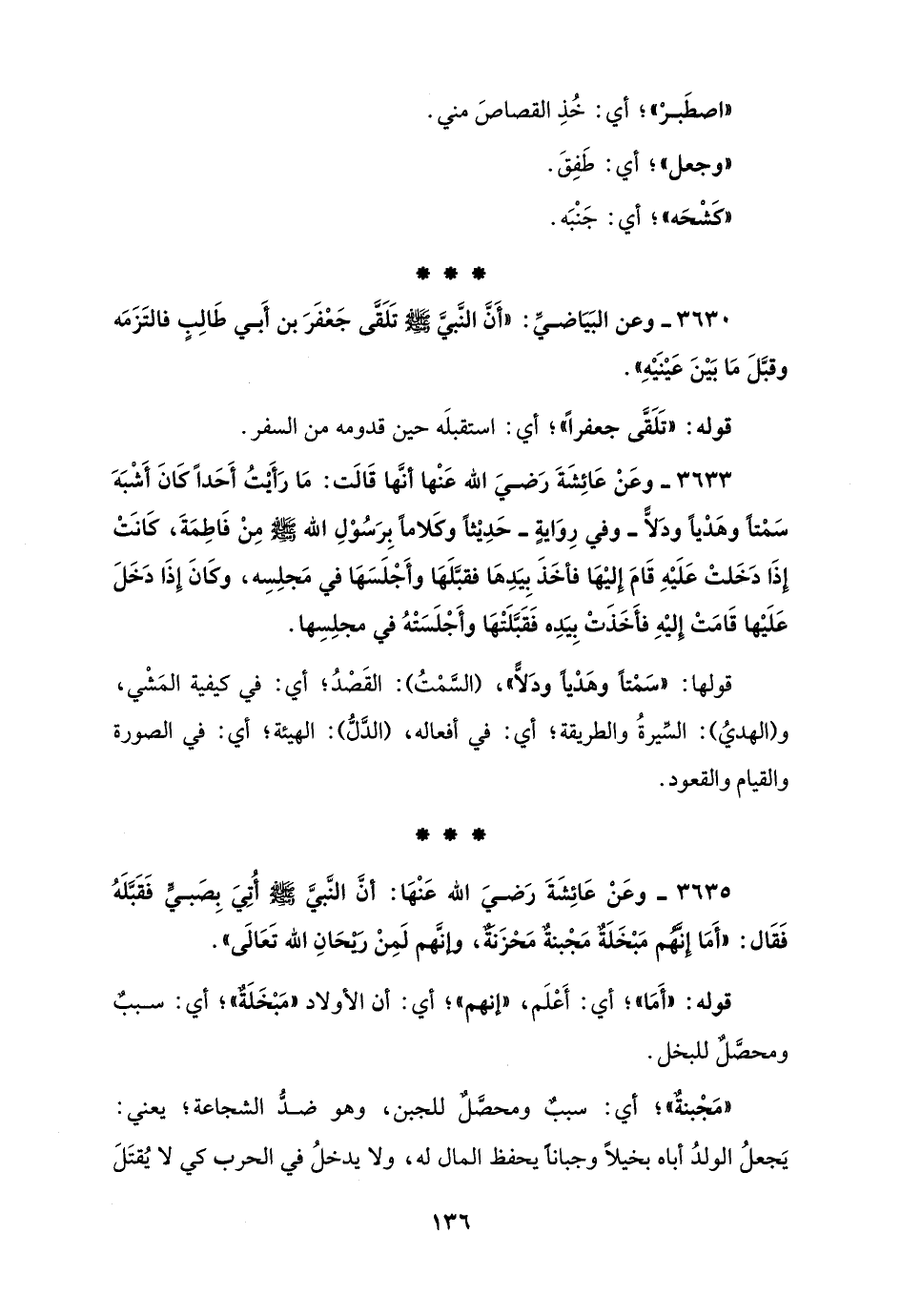 3630 - وعن البَيَاضيِّ: "أَنَّ النَّبيَّ - صلى الله عليه وسلم - تَلَقَّى جَعْفَرَ بن أَبي طَالِبٍ فالتَزَمَه وقبَّلَ مَا بَيْنَ عَيْنَيْهِ".