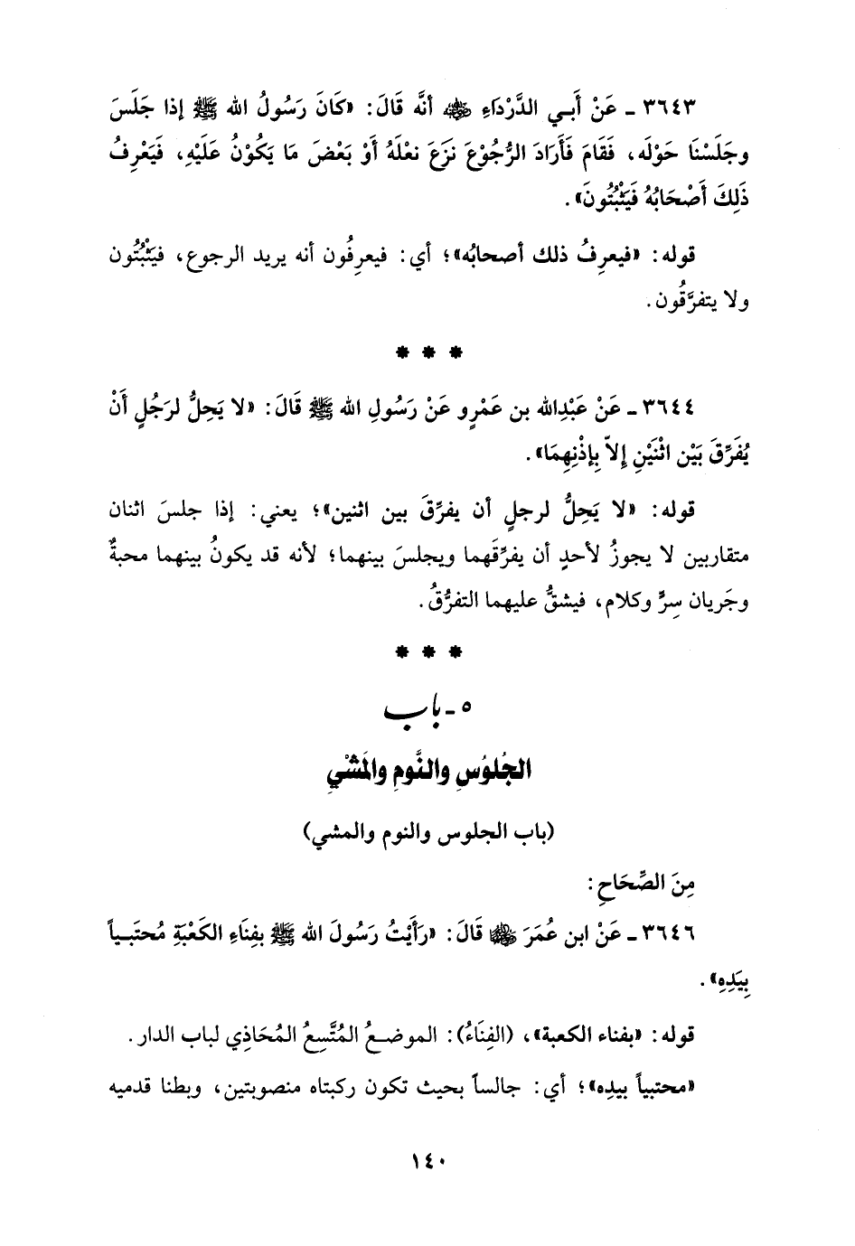 3643 - عَنْ أَبي الدَّرْدَاءِ - رضي الله عنه - أنَّه قَالَ: "كَانَ رَسُولُ الله - صلى الله عليه وسلم - إذا جَلَسَ وجَلَسْنَا حَوْلَه، فَقَامَ فَأَرَادَ الرُّجُوْعَ نَزَعَ نعْلَهُ أَوْ بَعْضَ مَا يَكُوْنُ عَلَيْهِ، فَيَعْرِفُ ذَلِكَ أصْحَابُهُ فَيَثْبُتُونَ".