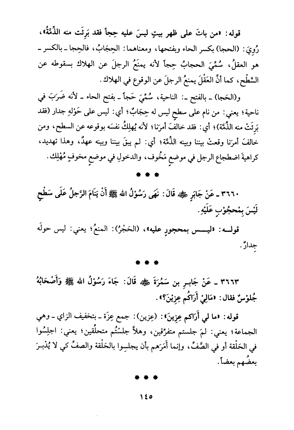 قوله: "من باتَ على ظهر بيتٍ ليسَ عليه حِجًا فقد بَرِئَت منه الذِّمَّةُ"، رُوِيَ: (الحجا) بكسر الحاء وبفتحها، ومعناهما: الحِجَابُ، فالحِجا - بالكسر - هو العقلُ، سُمِّيَ الحجابُ حِجًا لأنه يمنَعُ الرجلَ عن الهلاك بسقوطه عن السَّطْح، كما أنَّ العَقْلَ يمنعُ الرجلَ عن الوقوع في الهلاك.