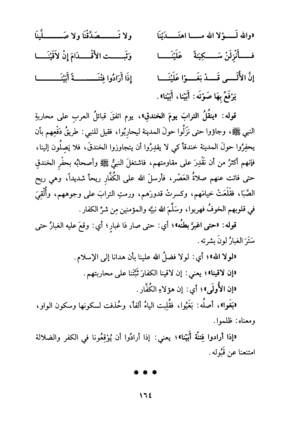 قوله: "ينقُلُ الترابَ يومَ الخندقِ"، يوم اتفقَ قبائلُ العربِ على محاربةِ النبي - صلى الله عليه وسلم -، وجاؤوا حتى نَزَلُوا حولَ المدينة ليحارِبُوا، فقيل للنبي: طريقُ دَفْعِهم بأن يحفِرُوا حولَ المدينة خندقًا كي لا يقدِرُوا أن يتجاوزوا الخندقَ، فلا يَصِلُون إلينا، فإنهم أكثرُ من أن نَقْدِرَ على مقاومتهم، فاشتغلَ النبيُّ - صلى الله عليه وسلم - وأصحابُه بحفْرِ الخندقِ حتى فاتت عنهم صلاةُ العَصْر، فأرسلَ الله على الكُفَّارِ ريحًا شديدًا، وهي ريح الصَّبَا، فقَلَعَتْ خيامَهم، وكسرتْ قدورَهم، ورمتِ الترابَ على وجوههم، وأُلْقِيَ في قلوبهم الخوفُ فهربوا، وسَلَّمَ الله نبيَّه والمؤمنين مِن شرِّ الكفار.